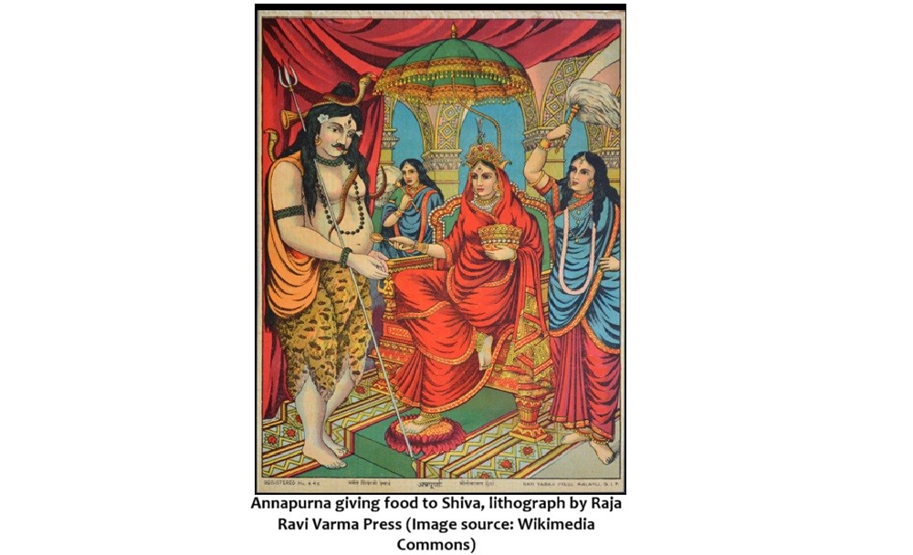 Annapurna giving food to Shiva, lithograph by Raja Ravi Varma Press (Image source: Wikimedia Commons)