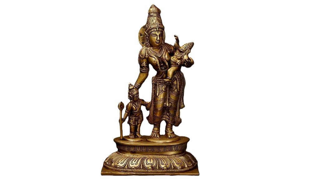 Parvati is depicted with distinctive symbols that represent her divine powers. Trident (Trishul) symbol destruction of evil, balance of forces. Lion or Tiger represent courage, strength, and dominance over fear. Lotus, spiritual purity and enlightenment. Conch, Bell, and Rosary symbol auspiciousness, meditation, and devotion. Children, typically Ganesha, is on her knee, while her younger son Skanda may be playing near her in her watch.