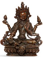 Common symbols include lotuses, elephants, and four arms carrying auspicious items like a pot, rosary, or lotus.