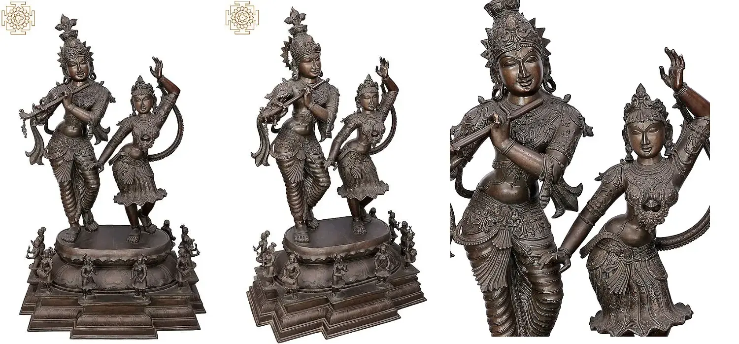 Krishna holding his flute to his lips, about to blow sweet tunes in it, and goddess Radha standing on his side, mirroring his beauty, the sculptural representation of the divine duo is known as “Jugal Jodi” (young couple). This is one of the most Beautiful sculptures of Radha-Krishna, often worshipped in homes to gain the blessings of the deities and create a sacred atmosphere.