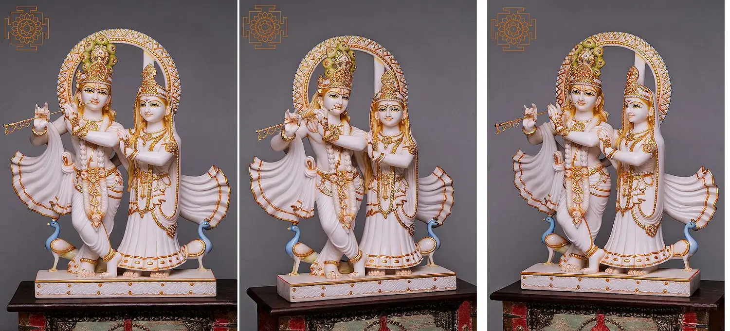 As if bathed in the light of Purnima’s moon, white marble statues of Radha-Krishna have been made popular, especially in modern times by the temples, whose central shrine houses marble icons of the duo. A durable and beautiful material, white marble is the perfect choice for expressing the otherworldly beauty of Radha-Krishna, and also a perfect choice for home temples and home decor.