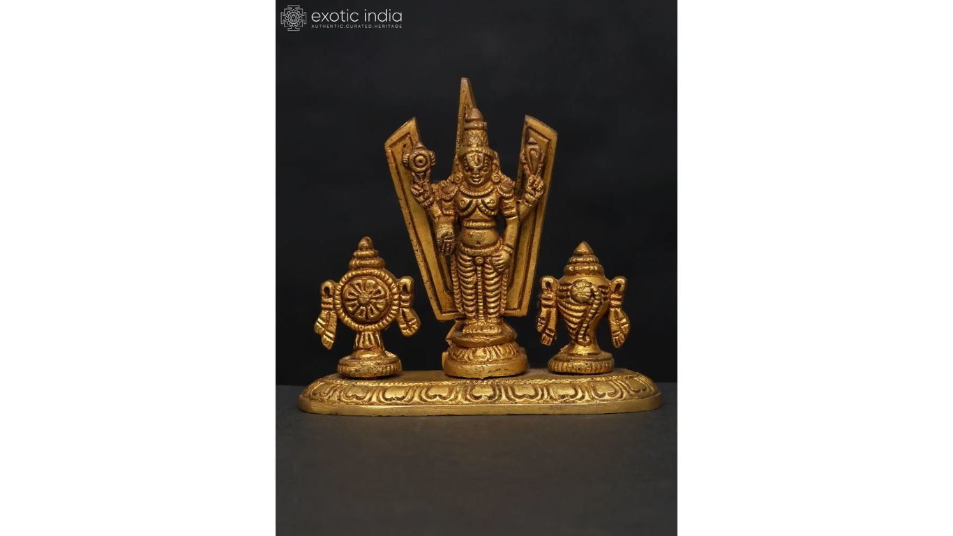 This brass Balaji statue presents the Lord of Tirumala with the powerful Vaishnava symbols- Shankha (conch), Chakra (discus), and Tilak (forehead mark). Placed on a lotus platform, the idol of Venkateshwara is ideal for Puja, decor, and festive gifting.