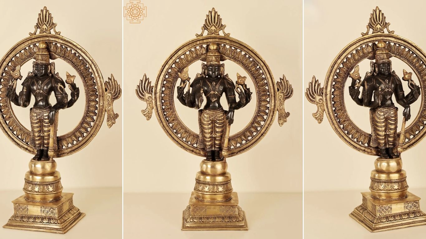 The connection between Vishnu and his Sudarshana chakra is underlined in this traditional brass statue, sculpted like the ritual images used in the Vaishanva temple. The chakra of Vishnu becomes the aura and background of his statue, in this portable ritual image that is ideal for festive worship or as a part of Lord Vishnu’s shrine.