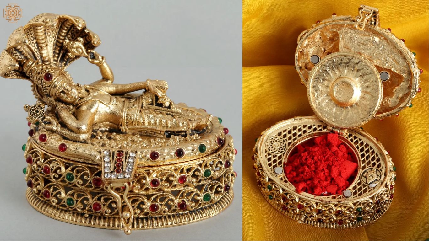 Bless your Puja routine with the presence of Lord Vishnu with this Sindoor box, marked by the divine icon of Anantashayana- the reclining form of Vishnu. Intricate details and tiny gems studded in the golden metal make this box a reminder of Vishnu’s omnipresent nature, adding a sacred value to your everyday practices.