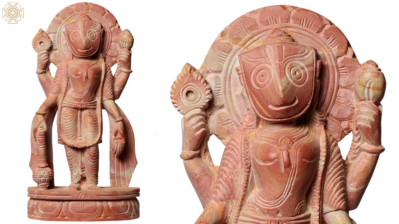 Jagannath, the Lord of the Puri temple, is Vishnu residing on earth. In this pink stone statue, a traditional sculpture from Orissa, the powerful identity of Jagannath is presented by his form as Chaturbhuja Vishnu, gently smiling and gracefully standing, almost alive with his divine presence.