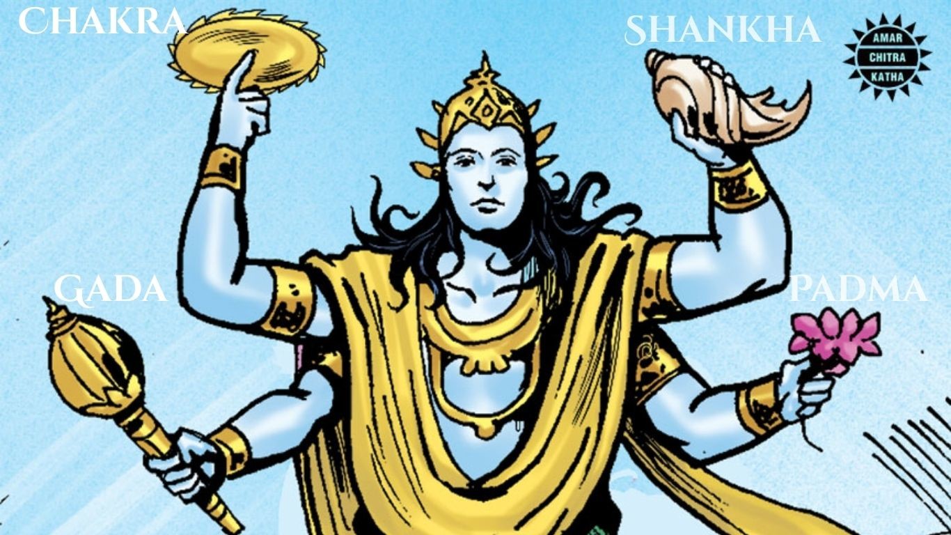 Lord Vishnu holds the Shankha (conch), Chakra (discus), Gada (mace), and Padma (lotus) each symbolizing a divine function like creation, time, power, and purity.