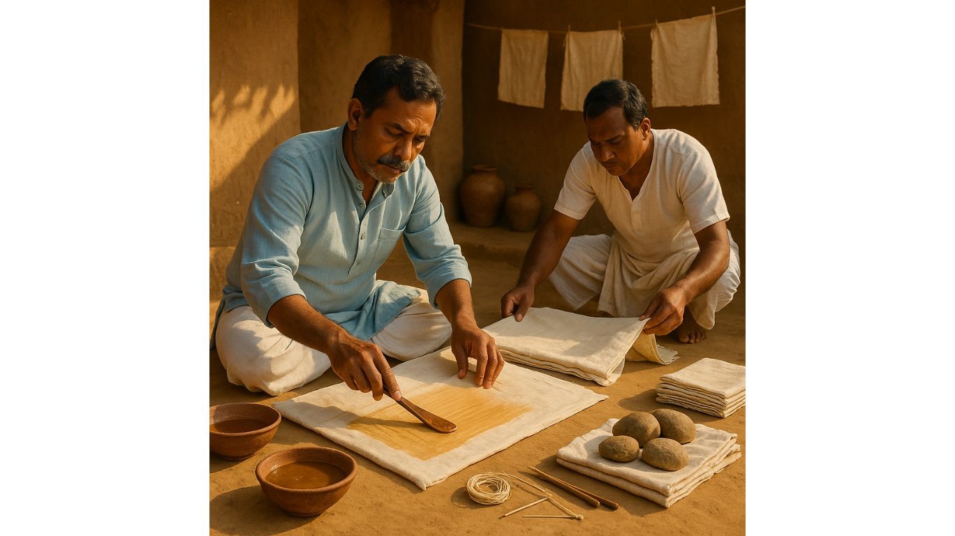 Two pieces of cotton or Tussar silk cloth are taken and pasted together using a paste of tamarind paste, prepared by soaking and grinding tamarind seeds. The gum, known as “Niryas Kalpa,” is used to prepare the “patti” on which the painting will be made.