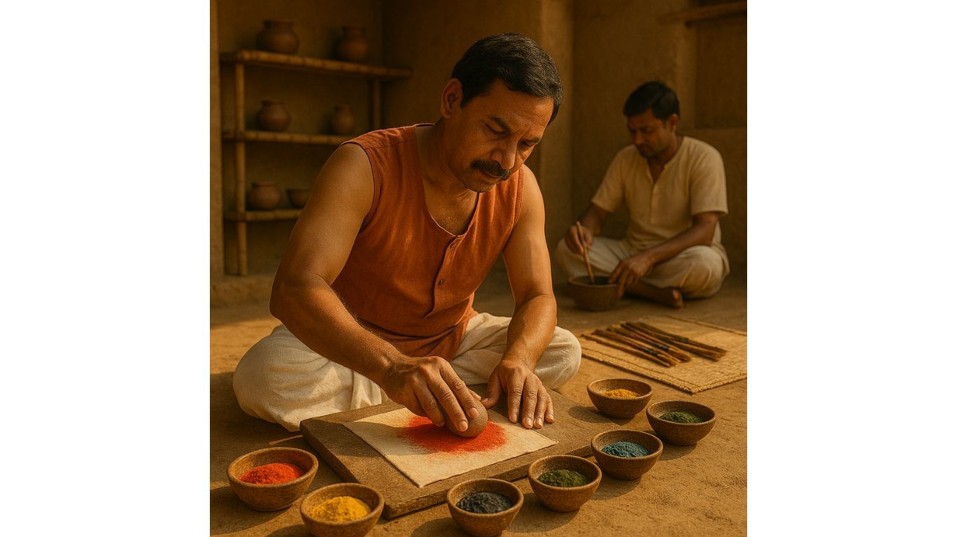 Artists use natural ingredients like tamarind paste, conch shell, soot, turmeric, harital, hingula, and handmade brushes from local plants and animal hair.