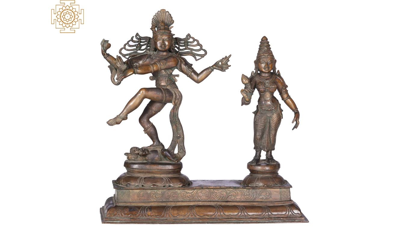 It is said that when Shiva dances as Nataraja, Parvati, as Shivakami, witnesses his dance. This idea is presented in this traditional Chola-style bronze Nataraja with Parvati. Accompanied by the beautiful Uma-Parvati, this idol of Nataraja is a magnified vision of what happens in the core of creation- the balance of Purusha and Prakriti (male and female principles).