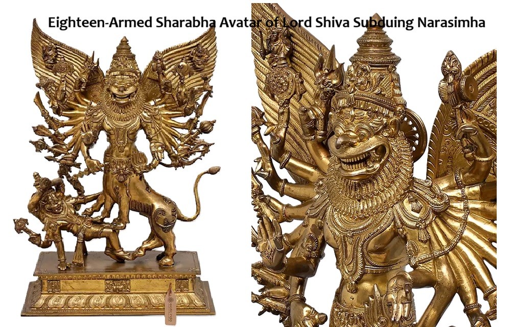 With a lion’s face, fierce fangs, winged, and bearing eight limbs, Sharabha manifests as the very form of Shambhu himself.