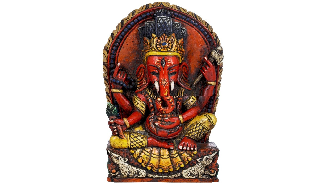 You can welcome this powerful form of Ganesha as this Nepalese wooden statue, where Ganapati’s Tantric aspect as well as his form as the protector of agriculture (symbolised by the reddish in his hand) is presented.
