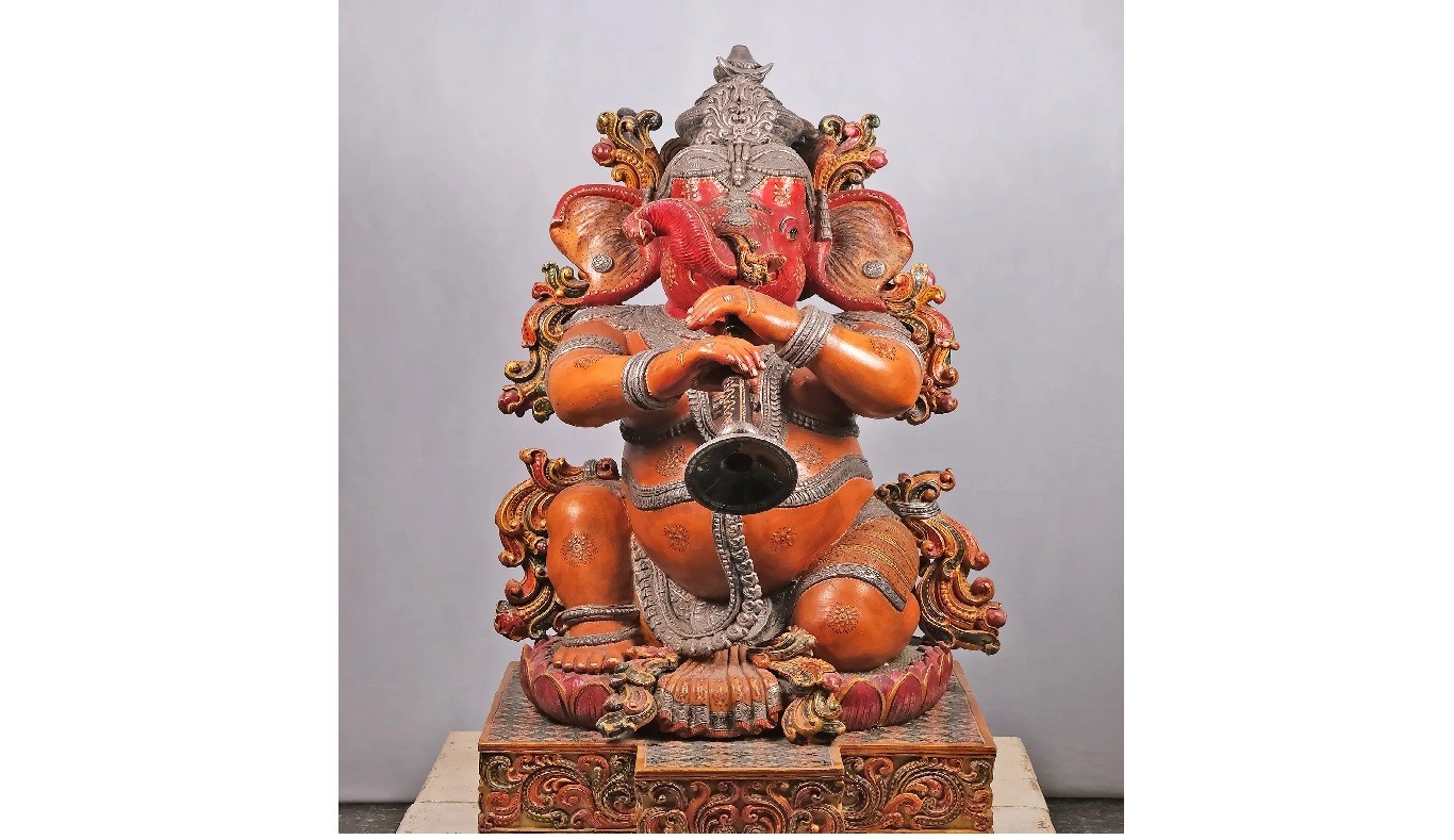 Another divine image of Kesari Ganesha is this wooden statue of Ganesha playing the trumpet, a joyous celebration of his ever-victorious nature, his beauty enhanced by the bright vermilion-saffron color of the sculpture.
