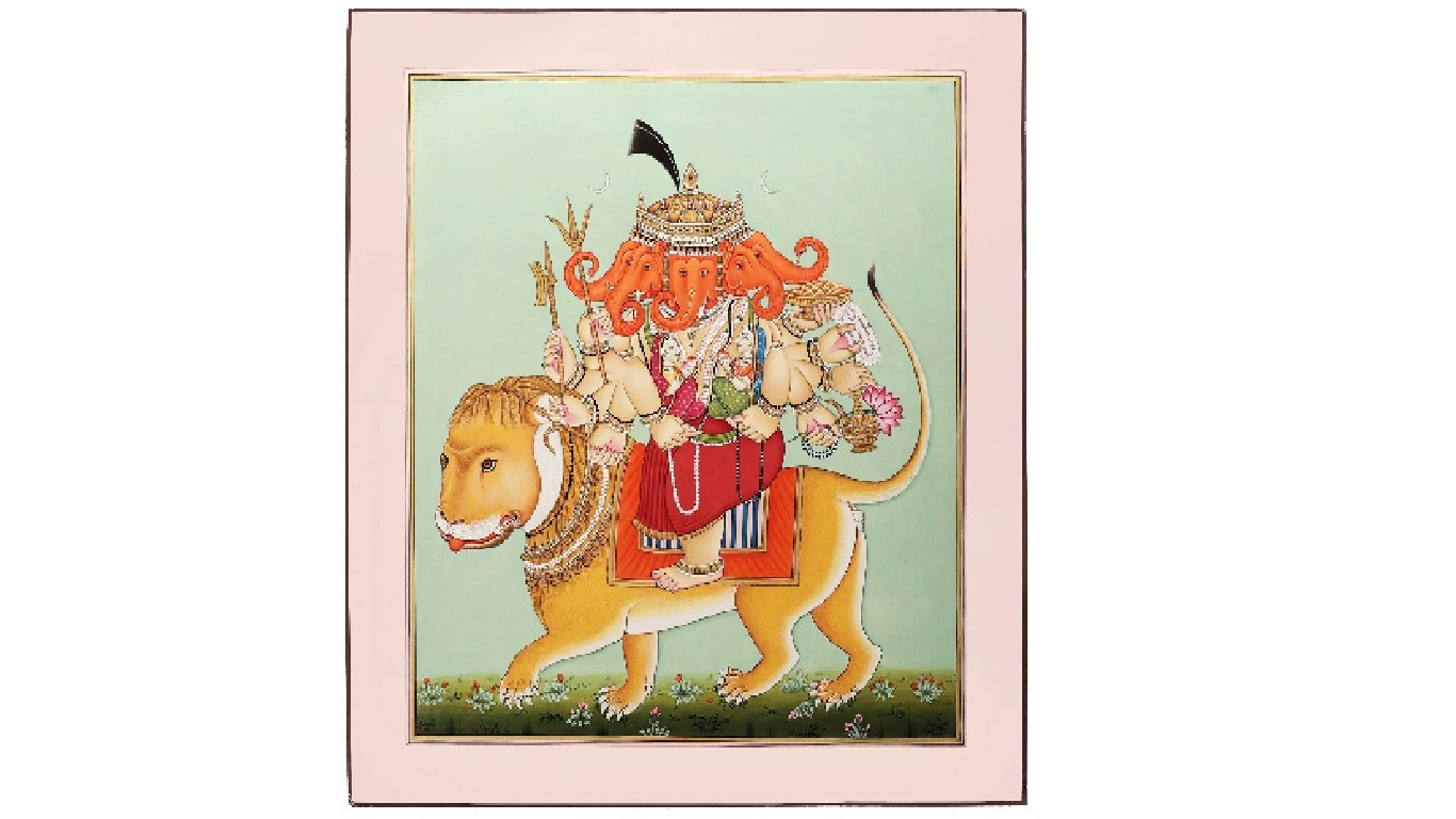 The potent and warrior nature of Kesari Ganapati is highlighted in this Rajput miniature painting of Simhavahana (lion-rider) Herambha Ganesha, appearing as the cosmic warrior, who, along with his Shaktis, always guards the universe.