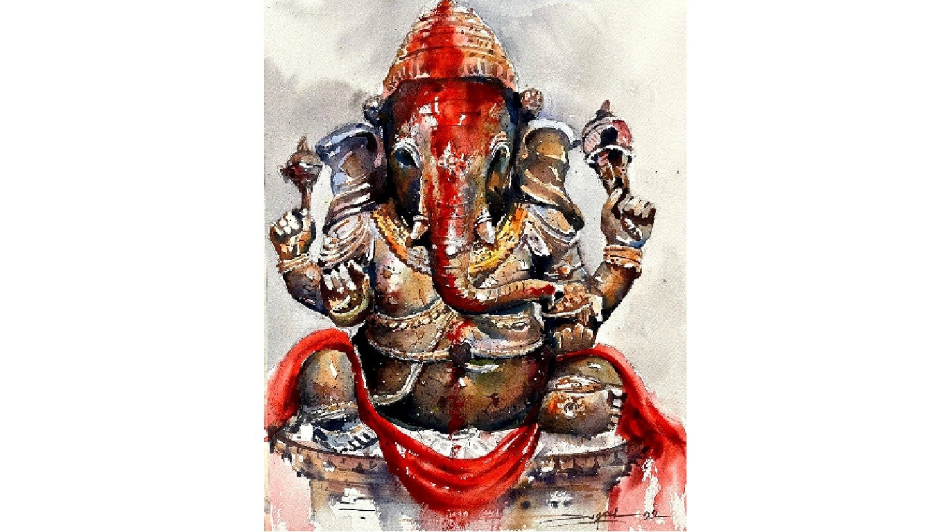 The ritual of offering Sindoor (vermilion) to Ganapati is captured in this modern acrylic on canvas painting by Jugal Sarkar, a window into the heart of living traditions of India.