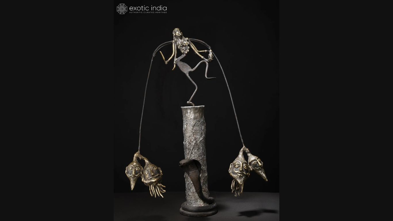 In this brass sculpture, Maa Kali appears on a mountain, Mandarachal, on which the universe is situated, wrapped by the serpent Vaasuki- the symbol of the axis of the Universe. With the head of the demon Rakabija, she performs a balancing act, like a Nati (a female folk performer), but on a deeper level, it signifies Kali as the balancing force that creates and destroys to maintain the flow of Kaal (time). Her features are simple but identifiable, and her thin body is inspired by the description in the Puranas, where her haggard and emaciated form is mentioned several times. Kali is eternal- this is proven by her ancient appearance in this modern work of art.