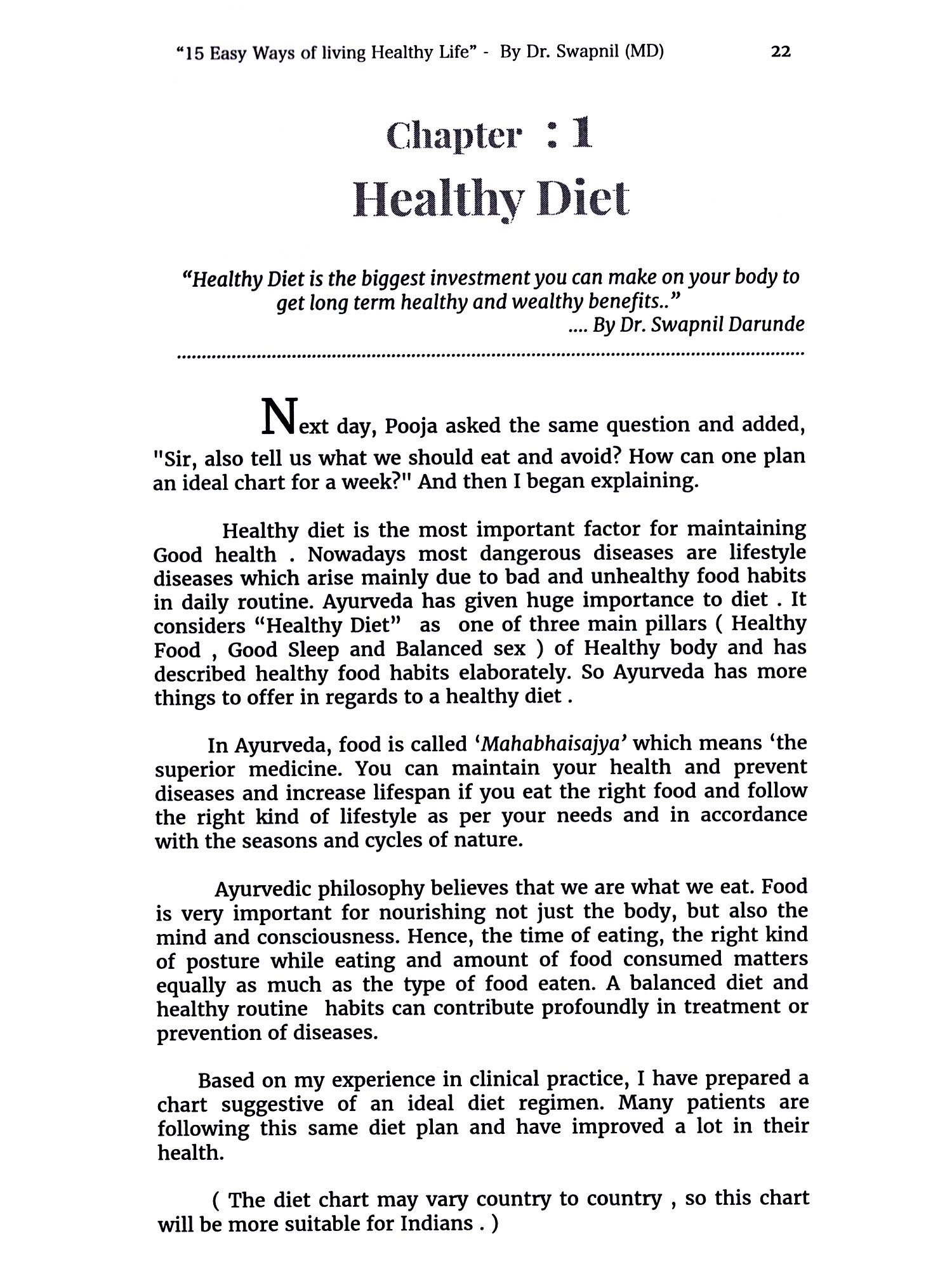 Dr. Swapnil is pure Ayurveda detox specialist and lifestyle coach. He has been practising since last 7 years essentially on lifestyle diseases at his clinic in Powai, Mumbai based on his belief that healthy food and lifestyle are the greatest medications a doctor can advice. He specialised in detoxification therapy, also called as Panchakarma, with minimally prescribed medicines. Many foreigners visit or consult him for detoxification and lifestyle coaching. He has also been a professor in different Ayurveda medical colleges since 7 years. He has published many national and international article based on health in various journals and magazines and has been awarded for his efforts. He is well experienced with an expertise in the field of health and lifestyle management which allowed him to write this book containing all the details and valuable tips regarding health in a simple manner.