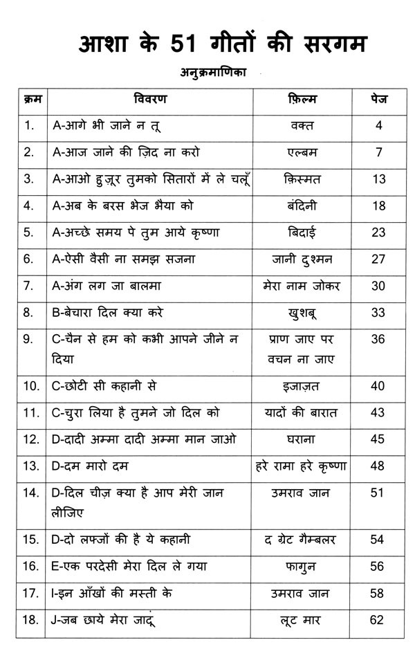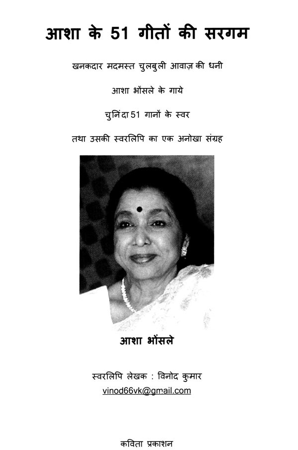 विनोद कुमार द्वारा "मुकेश के 51 गीतों की सरगम", "लता के 51 गीतों की सरगम", "किशोर के 51 गीतों की सरगम", "मो. रफ़ी के 51 गीतों की सरगम" तथा "मो. रफ़ी के 51 गीतों की सरगम, भाग-2" नामक पुस्तकों की अपार सफलता के पश्चात संगीत प्रेमियों हेतु "आशा के 51 गीतों की सरगम" पुस्तक प्रस्तुत है। इस पुस्तक की मदद से संगीत की प्रारंभिक जानकारी रखने वाला व्यक्ति भी आसानी से किसी भी वाद्य यन्त्र पर गीत बजा सकता है व उसका आनंद ले सकता है।