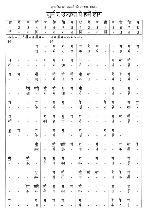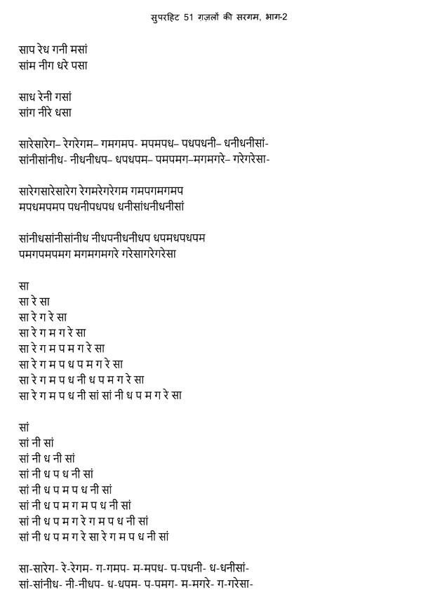 ग़ज़ल प्रेमियों का ग़ज़लें सुनने का जुनून सर्वोपरि है. ग़ज़ल गायक गायिकाओं के प्रति उनका प्यार और उनका लगाव अतुलनीय है. ग़ज़ल गायकों के प्रोग्राम खचाखच भरे देखे गए हैं. आज भी लोग ग़ज़ल महफ़िलों में शामिल होने ग़ज़लों को सुनने की तमन्ना रखते हैं. ग़ज़ल प्रेमियों के आग्रह पर "सुपरहिट 51 ग़ज़लों की सरगम", भाग-2 पुस्तक प्रकाशित की गयी है. इससे ग़ज़ल प्रेमियों को घर बैठे ग़ज़लें गाने बजाने में सुविधा होगी. इस पुस्तक में जगजीत सिंह, गुलाम अली, मनहर उदास, चित्रा सिंह, मो. रफ़ी, मेहँदी हसन, कुमार शानू, नुसरत फतेह अली, नूरजहाँ और साथ ही लता मंगेशकर की गायी अनेक ग़ज़लें इसमें शामिल हैं. यह गज़ल प्रेमियों के लिए एक खज़ाना है. इस पुस्तक में उपलब्ध सरगम की मदद से संगीत की प्रारंभिक जानकारी रखने वाला व्यक्ति आसानी से इन ग़ज़लों को अपने वाद्य पर बजा सकता है और उनका आनंद ले सकता है. यह संग्रह करने योग्य पुस्तक है|