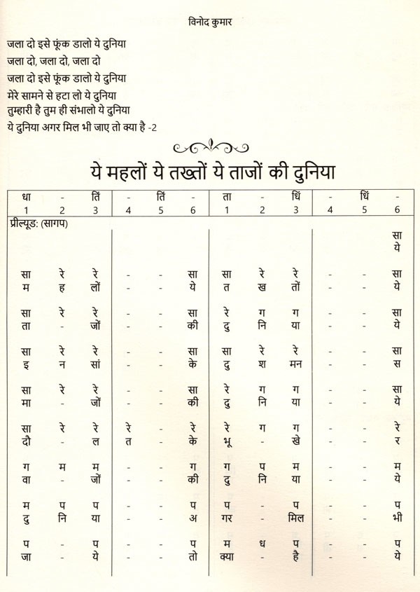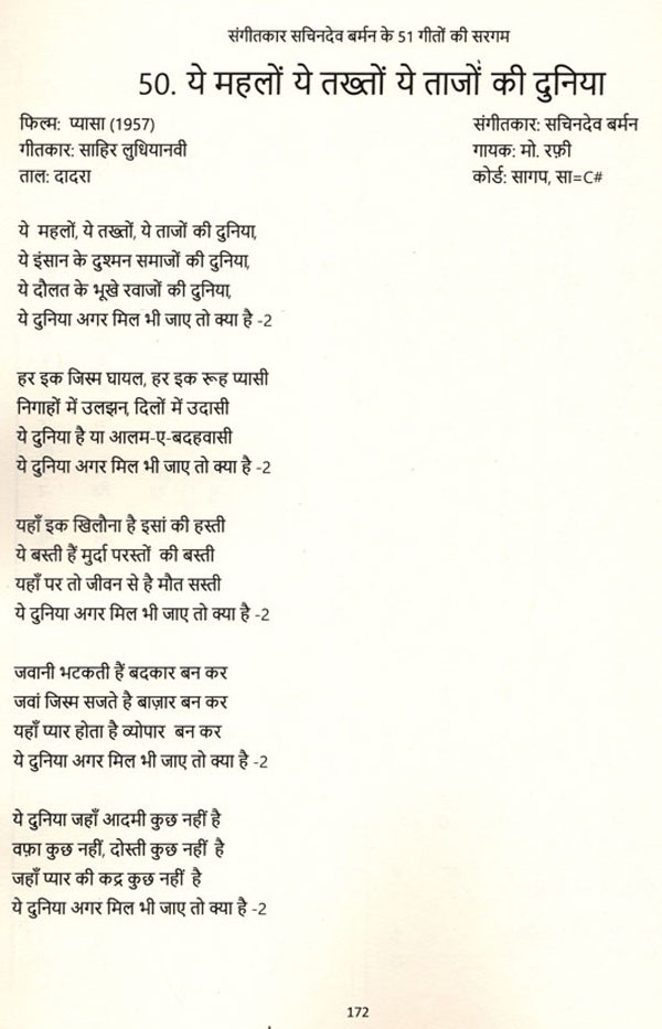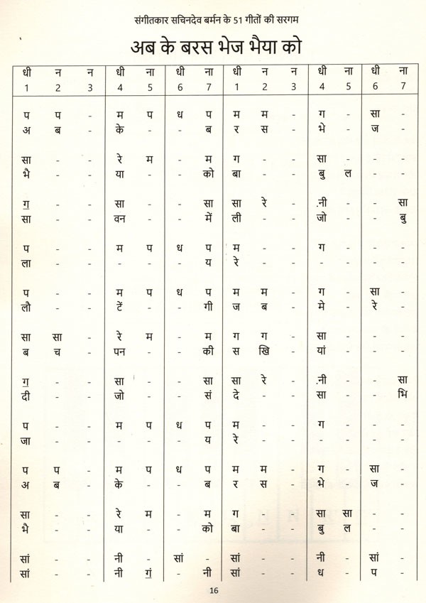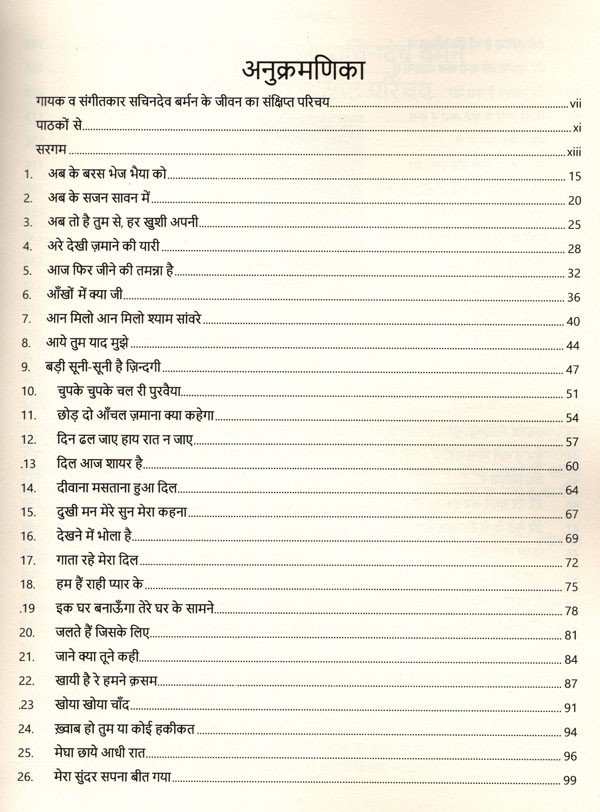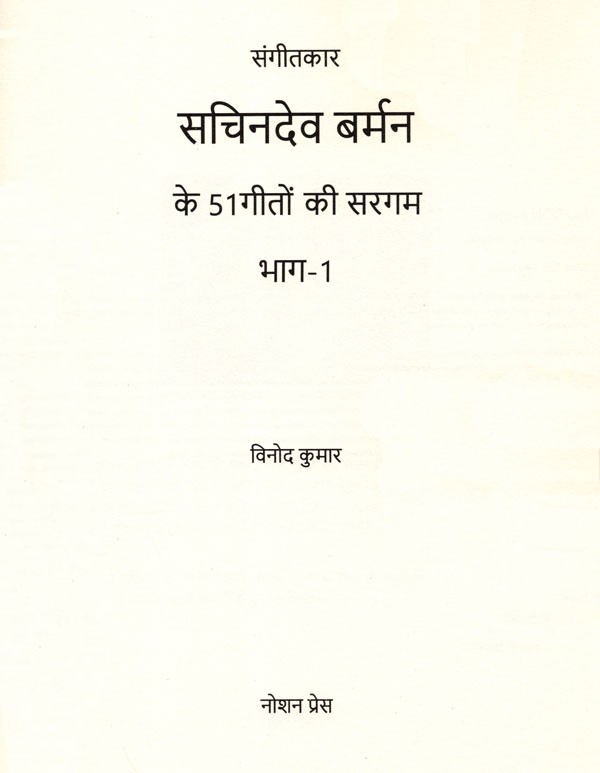 सुप्रसिद्ध संगीतकार सचिनदेव बर्मन के संगीतबद्ध 51 गीतों की सरगम, भाग-1 का संग्रह करने योग्य अनोखा गुलदस्ता इस पुस्तक के रूप में प्रस्तुत है. वर्धन दा के संगीतबद्ध सुपरहिट गीतों के स्वर और उनकी स्वरलिपि हिंदी में इस पुस्तक में तर ताल के साथ लिखकर प्रस्तुत की गयी हैं. इसमें मौतों को शल्यूड और इंटस्लुङ भी स्था संभव दिया गया है. गीत के साथ बजाई जा सकने वाली एक कोर्ड च्या उल्लेख भी किया पही है संगति की प्रारंभिक जानकारी रखने वाला व्यक्ति आसानी से इन गीतों को अपने वाद्य घर बजा सकता है और उनका आनंद ले सकता है।