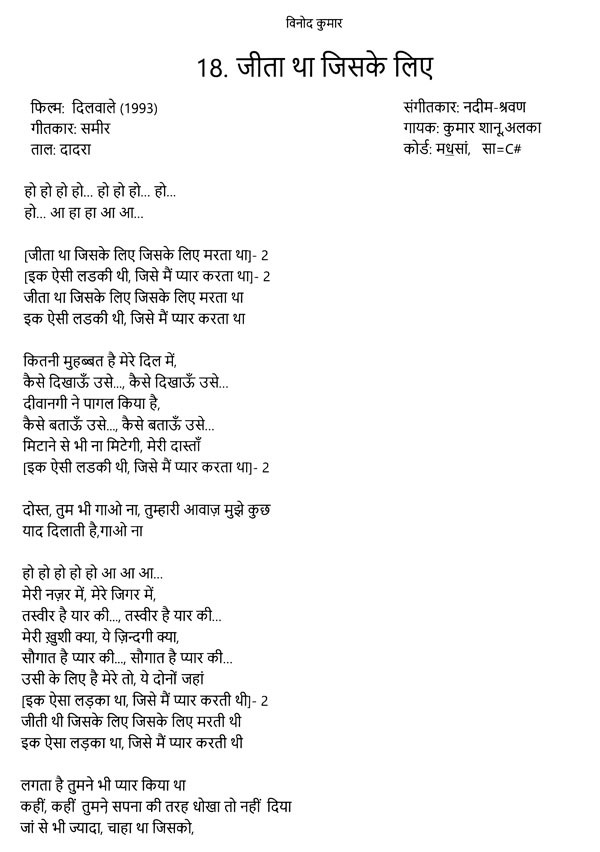 जन जन के दिल पसंद मशहूर गायक कुमार शानू के गाये 51 गीतों के स्वर और उनकी ताल सहित आसान स्वरलिपि इस पुस्तक में प्रस्तुत है. इसमें गीतों का प्रील्यूड और इंटरलूड भी यथा संभव दिया गया है. गीत के साथ बजने वाली एक कोर्ड का उल्लेख भी किया गया है. संगीत की प्रारंभिक जानकारी रखने वाला व्यक्ति आसानी से इन गीतों को अपने वाढ्य पर बजा सकता है और उनका आनंद ले है|