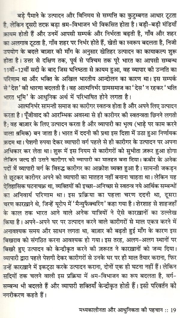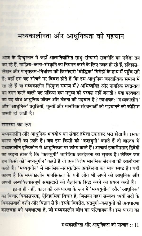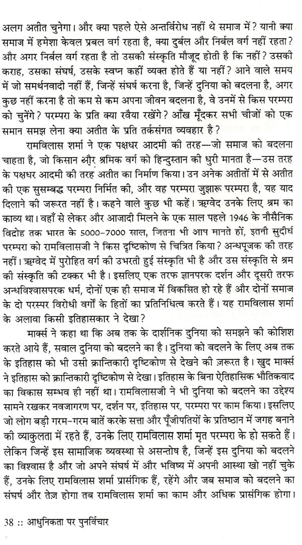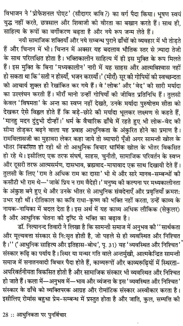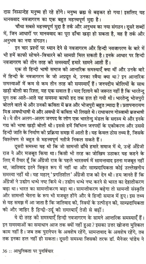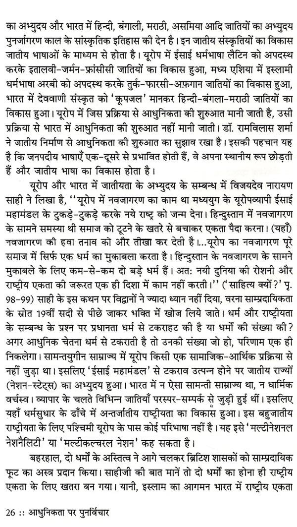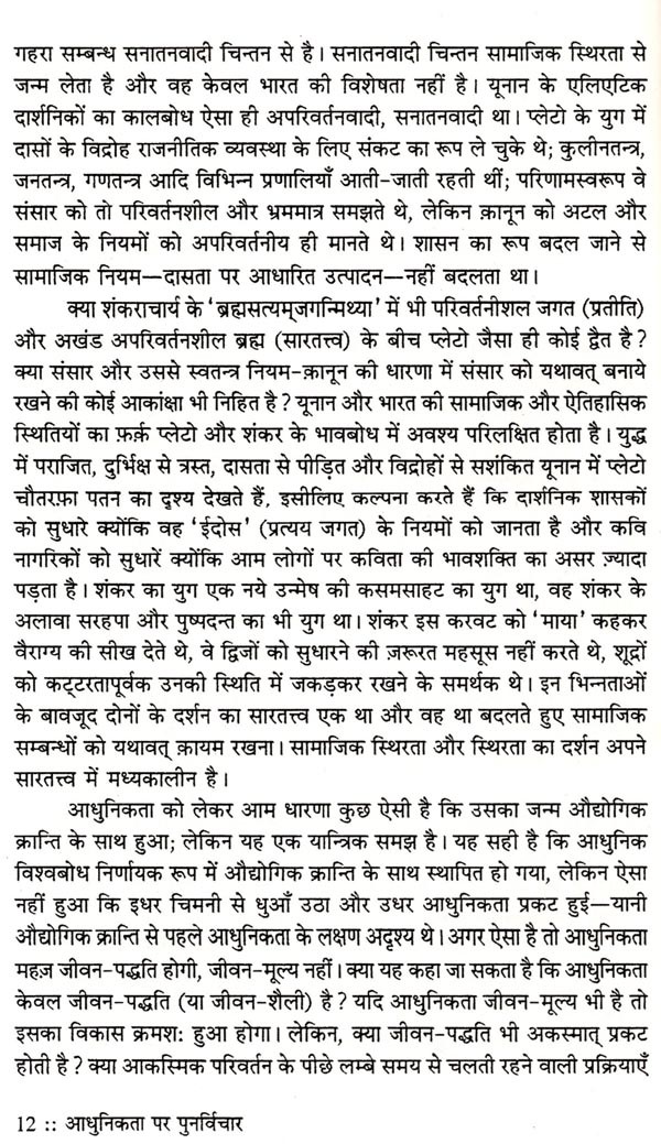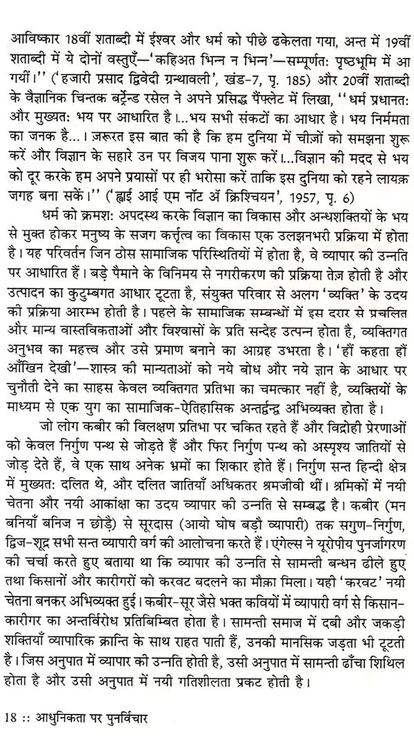दुनिया में आधुनिकता का इतिहास लगभग पाँच शताब्दी का हो गया है। अपने आरम्भिक दौर में जो चेतना परिस्थिति बोध के साथ उदित हुई, वर्तमान दौर में वह तात्कालिक-आनन्द के उत्सव में पर्यवसित हो रही है। आरम्भिक दौर में उसे मध्यकालीन चेतना से संघर्ष करते हुए आगे बढ़ना था, वर्तमान दौर में उत्तर-आधुनिक चिन्तन से अपने अपरिहार्य सम्बन्ध को परिभाषित करना है। मध्यकालीन समाज सामन्ती सम्बन्धों से बना था, उत्तर-आधुनिक समाज वृद्ध पूँजीवाद के उपभोक्तावादी बाज़ार-तन्त्र से बना है। इन प्रक्रियाओं और अन्तर्द्वन्द्वों का विवेचन अगर आसान होता तो हिन्दी में इस प्रकार की अनेक पुस्तकें होतीं। 'आधुनिकता पर पुनर्विचार' इस दिशा में अव्यवस्थित प्रयास से ज़्यादा कुछ नहीं है। इसके लेख बीस वर्षों से ज़्यादा की अवधि में अलग-अलग समय पर लिखे गये हैं। कुछ लेख सोवियत संघ के विघटन से पहले के हैं (जैसे, 'सौन्दर्य चिन्तन : कुछ प्रश्न) और कुछ लेख 2010 के हैं (जैसे, 'उत्तर-आधुनिक विश्व और प्राक् आधुनिक विश्वबोध')। कुछ लेख व्याख्यान के रूप में थे, जिन्हें संशोधन के साथ यहाँ प्रस्तुत किया गया है, कुछ लेख शोधपत्र के रूप में लिखे गये हैं। कुछ लेख अनुचिन्तनपरक निबन्ध के रूप में तैयार किये गये हैं। इन सभी लेखों, निबन्धों, व्याख्यानों और शोधपत्रों का सम्बन्ध आधुनिकता की प्रक्रिया से है। इसलिए उन्हें एक साथ प्रस्तुत करना उपयुक्त जान पड़ा। इन सभी लेखों, निबन्धों आदि का सन्दर्भ-बिन्दु भारतीय समाज, विशेषतः हिन्दी-भाषी समाज है। अन्तरराष्ट्रीय विवादों को भी अपने समाज की आवश्यकताओं की कसौटी पर जाँचने का प्रयास किया गया है। इसका कारण है। औपनिवेशिक विरासत के कारण भारत जैसे समाजों की वास्तविकताएँ और आवश्यकताएँ वही नहीं हैं जो उपनिवेशवादी समाजों की हैं। आज भी उत्तर और दक्षिण का भेद विकसित और विकासशील दुनिया के अन्तर्विरोध के रूप में मौजूद है। सांस्कृतिक प्रक्रियाएँ और बौद्धिक अवधारणाएँ विशिष्ट सामाजिक-ऐतिहासिक परिस्थिति से सम्बद्ध होती हैं। पश्चिम की अवधारणाओं को ज्यों का त्यों अपनाकर ज्ञानी बने फिरना उपनिवेश बनकर गर्व करने जैसा है। प्रकृतिविज्ञान और समाजविज्ञान में ऐसा उपनिवेशीकरण बहुत अधिक है, लेकिन मानविकी (भाषा, साहित्य और संस्कृति) भी उससे अछूता नहीं है। भूमंडलीकरण के साथ बौद्धिक उपनिवेशीकरण बढ़ भी रहा है और बढ़ाया भी जा रहा है। इस प्रकार के बौद्धिक और सांस्कृतिक उपनिवेशीकरण के विरुद्ध लैटिन अमरीका और अफ्रीका के देशों में जबर्दस्त अभियान चलाया गया था, जिसे 'मस्तिष्क का निरुपनिवेशीकरण' (डिकॉलिनाइजिंग द माइंड) कहा गया था। भारत में ऐसे अभियान की आवश्यकता अब भी बनी हुई है। बल्कि बढ़ रही है। स्वभावतः 'आधुनिकता पर पुनर्