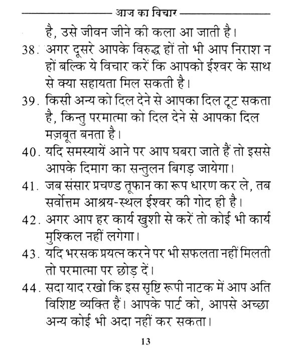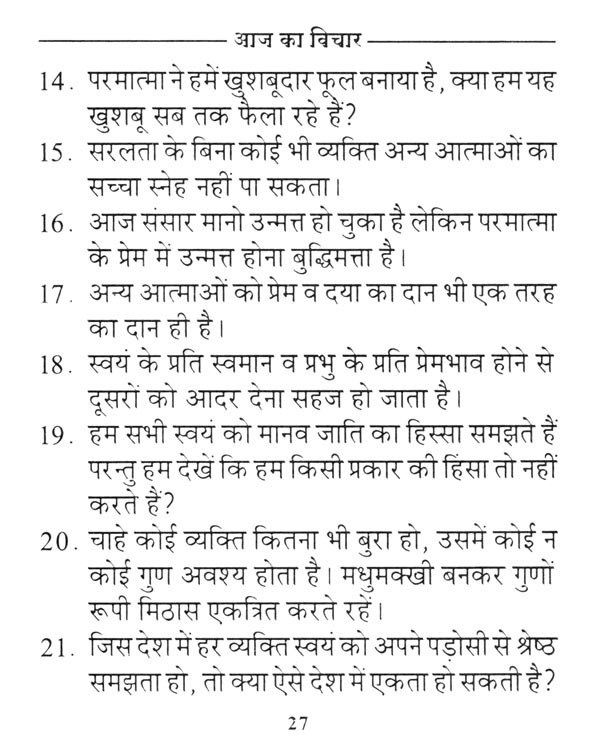 इन श्रेष्ठ विचारों की प्रेरणा प्रदान करने के लिए प्रजापिता ब्रह्माकुमारी ईश्वरीय विश्व विद्यालय बधाई का पात्र है। ये ऐसे शब्द हैं जो न तो कभी पुराने होंगे और न ही इनकी सत्यता पर समय का प्रभाव पड़ेगा।