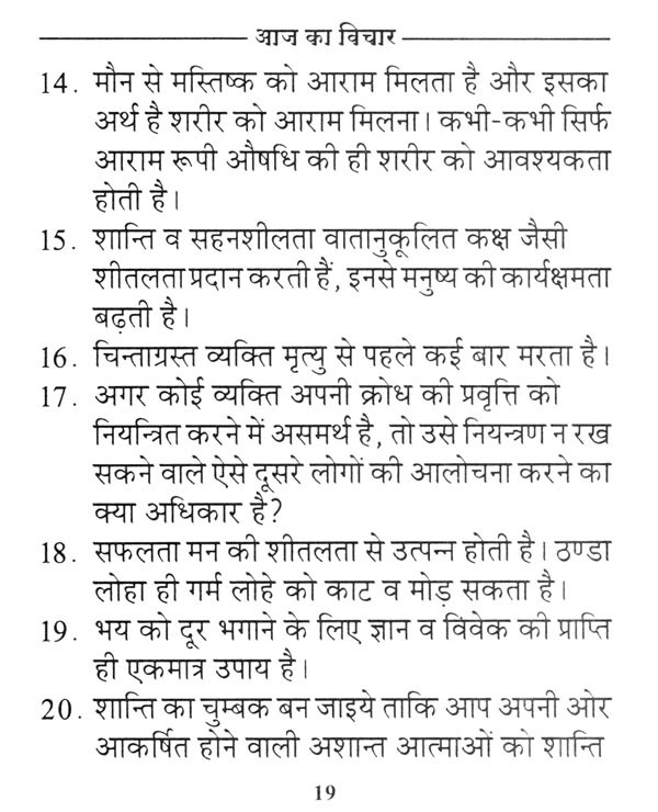 "आज का विचार" नामक इस पुस्तक में जो विचार प्रस्तुत किए गए हैं वे मूलतः "बारबाडोज एडवोकेट" नामक पत्रिका में प्रकाशित हुए थे। प्रस्तुत पुस्तक में इन प्रेरणादायक विचारों को एकत्र कर प्रकाशित किया जा रहा है। इससे पाठकों को किसी विशेष मनोवृत्ति के लिए अनुकूल विचार पर चिन्तन करने का अवसर सुलभ हो सकेगा।