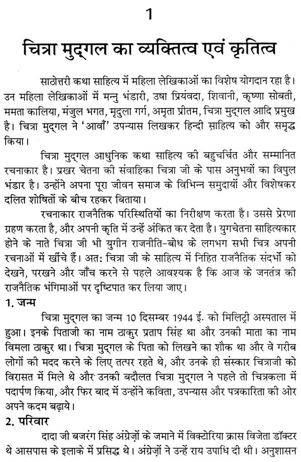 प्रथम अध्याय में चित्रा मुद्गल के व्यक्तित्व और उनके कृतित्व पर विचार किया गया है। जैसे उनका बचपन, शिक्षा, परिवार, वैवाहिक जीवन, आजीविका और कृतित्व। प्रखर चेतना की संवाहिका चित्रा मुद्गल के पास अनुभवों का विपुल भंडार है और हिन्दी कथा साहित्य में उनके योगदान की चर्चा भी की गई है।