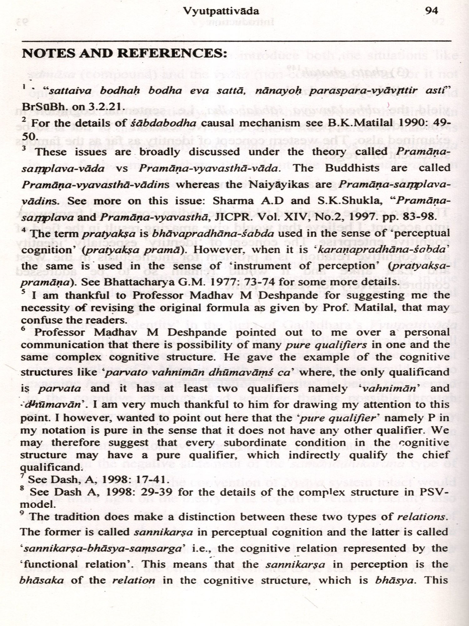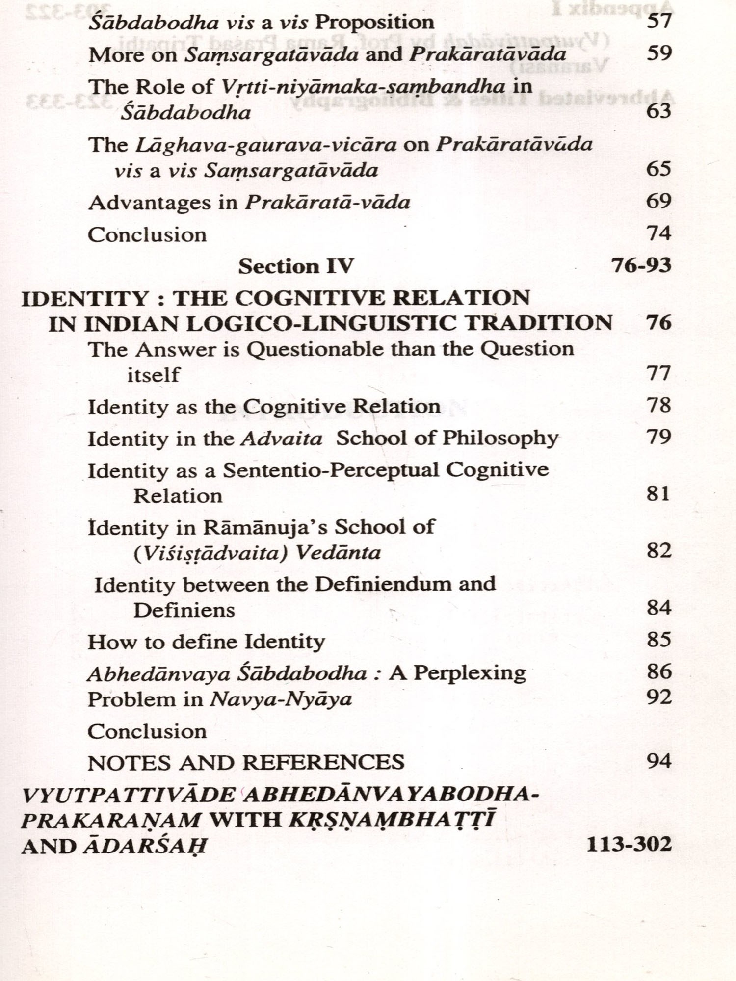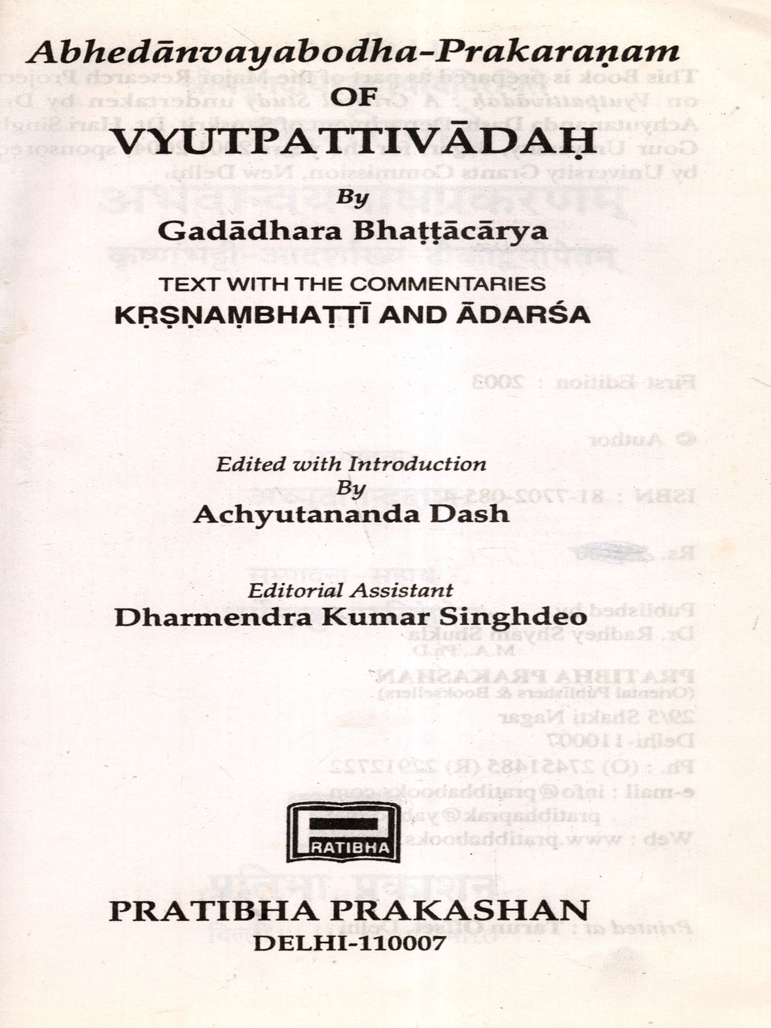 I started intensive svadhyaya on Vyutpattivada while I was at the University of Oxford during 1997-98 on a Commonwealth Academic Staff Visiting Fellowship. On my return to India, I proposed a Major Research Project to UGC, on "Vyutpattivada: A Critical Study" which I got in 2001. The present volume partly fulfils the work as planned for the project. In this edition of Vyutpattivada I have brought out the text only up to Abhedanvaya-prakarana. The text is based on the critical apparatus (forth-coming) with the help of almost all the available editions along with the commentaries Krsnabhațți by Krsnabhatta and Adarsa by Pt. Sudarsana sastri. The other special feature in this edition is that, the paragraphs are marked with paragraph code numbers starting with VV that stands for Vyutpatti-Vada in the text. The three digit numbering system is introduced here to classify the main topic of discussion, the sub-topics and the internal arguments on the issues concerned. After a thorough examination of the commentaries, I am confident that this classification of the text would provide the most suitable arrangement of the arguments of the texts Vyutpattivada.