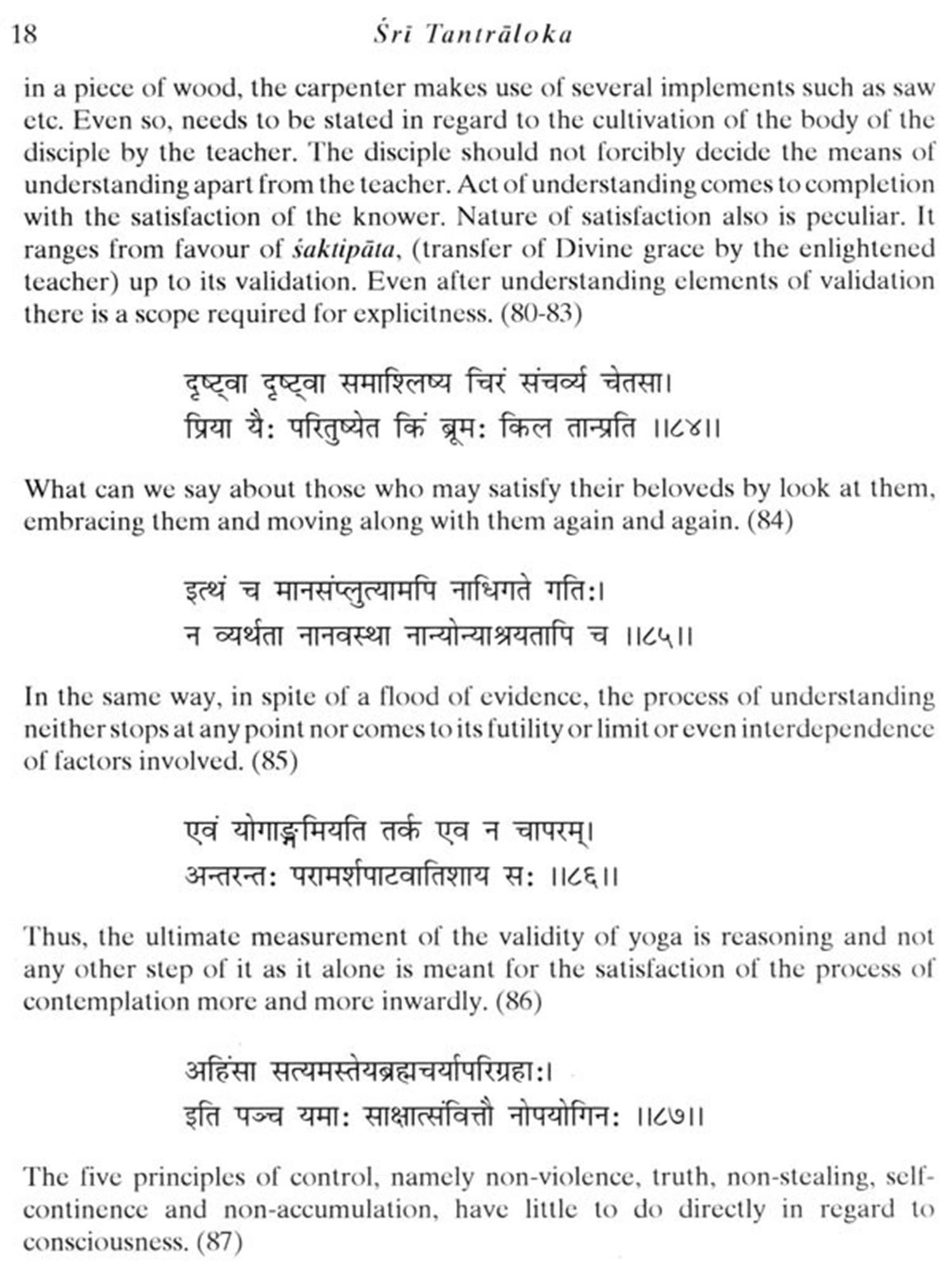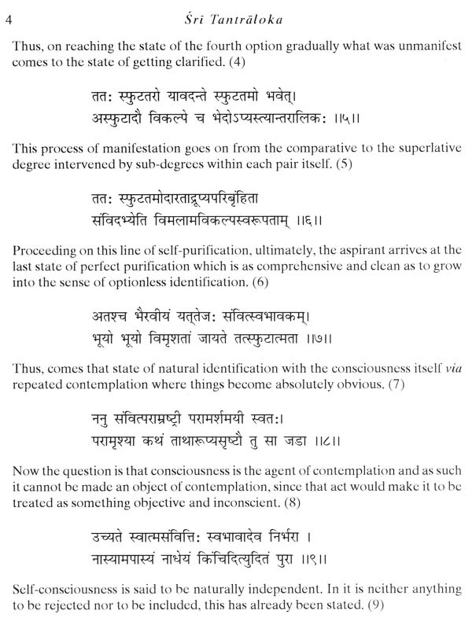 To the best of my knowledge the present is the first complete English translation of this colossal work rendered by the combined efforts of Professor Satya Prakash Singh and Swami Maheshvarananda with their years of practice of yoga and tantra, philosophy Eastern and Western, psychology Freudian and Jungian, Sanskrit and English. This is evident from dozens of their publications and papers ranging over areas like yoga, history and culture on A.N. Whitehead, C.G. Jung. Veda and the history of yoga, linguistics and many more. It was by virtue of deep understanding that an English translation of such a massive work as the Tantraloka could be accomplished lucidly by these scholars after a lapse of almost a millennium from the time of Abhinavagupta himself. But for Tantraloka, the disciplines of Yoga and Tantra would have remained only a dream in its relationship to philosophy and yoga. Tantraloka, indeed, by virtue of its wide and integrative attempt, would have been lost for ever to the modern world getting diminished to the state of a mere cult instead of opening the doors to the mystery of human psychology and physiology.