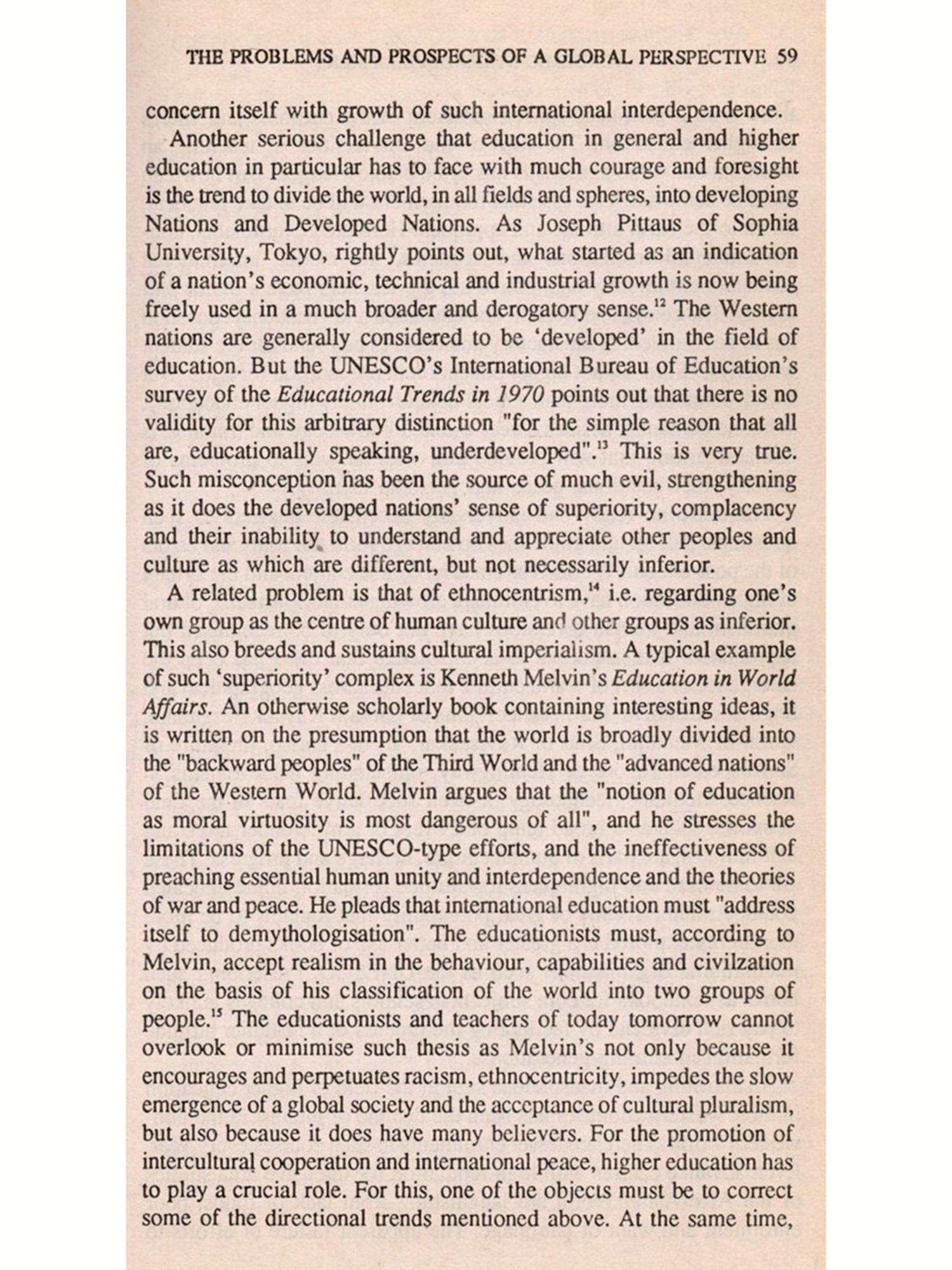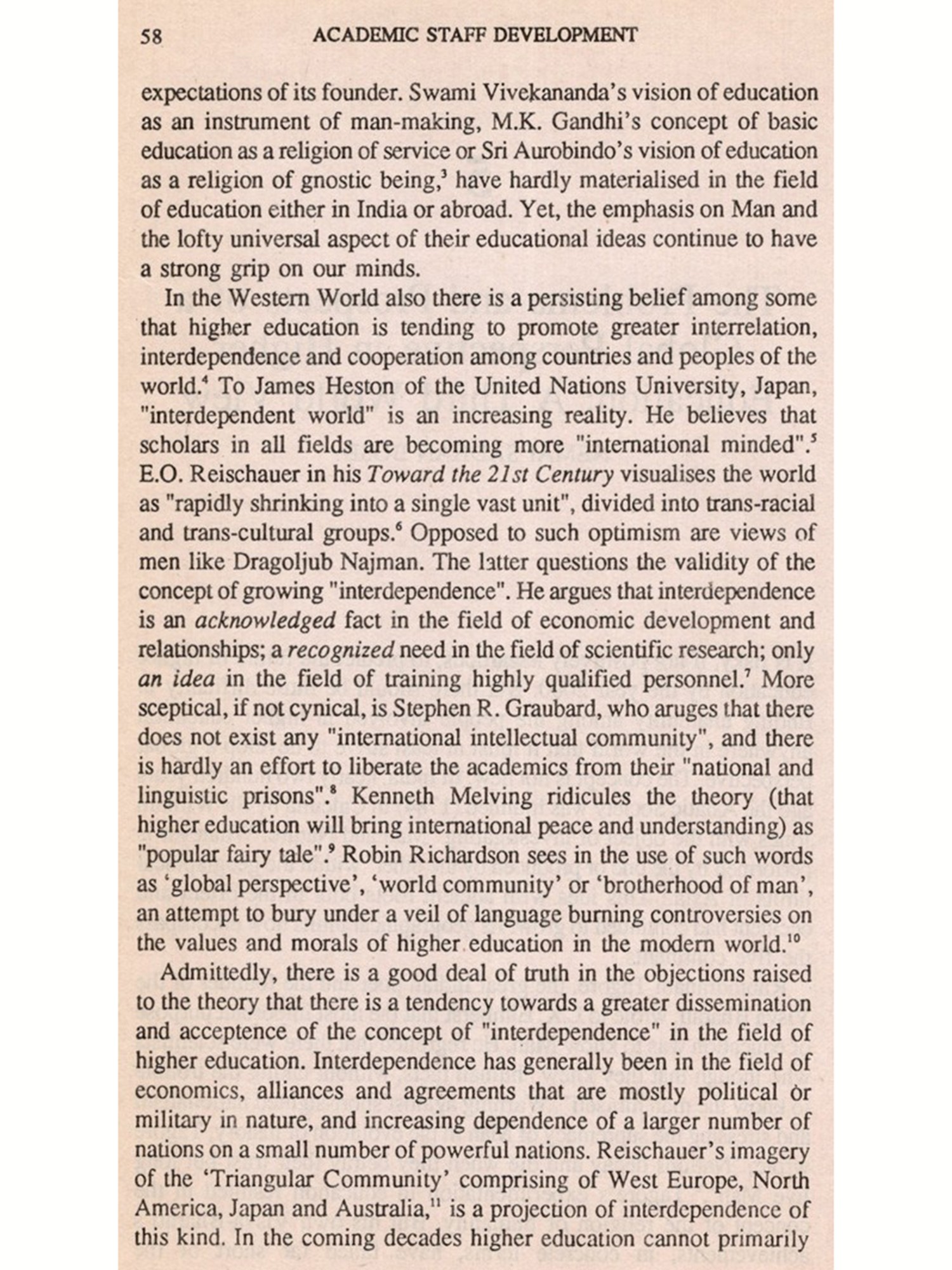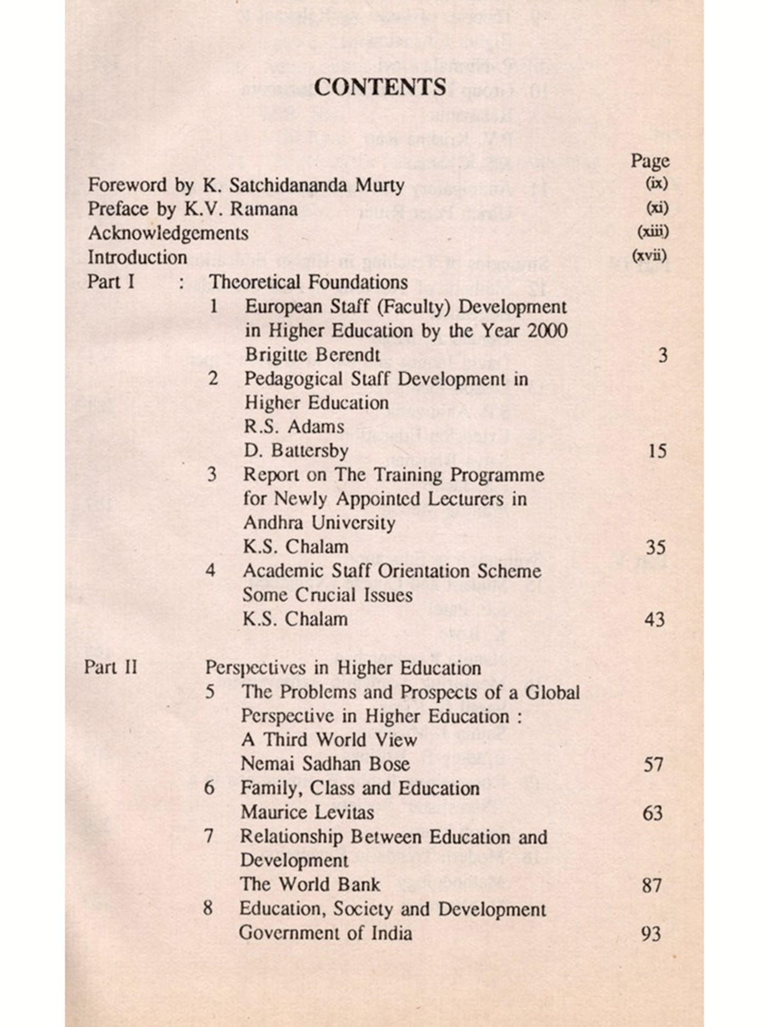 The Academic Staff Development Scheme must base its orientation on certain philosophical and socio-economic perspectives of the whole system. It must also provide the links between society, development and education. It is necessary that the newly oriented teacher should develop a broad horizon in working in the higher education system from a global context and view the possible changes in the future. The teachers in the colleges and universities are also expected to know about the influence of the family and class on the academic achievement of adult students in a classroom. The students should also be convinced by the teachers that education is an investment and in a developing country like India, it is a social investment. The ultimate aim of any education, they must be told, is to uplift the society and aid the process of development. The readings on the 'perspectives in higher education' are concentrated broadly on the above ideas.