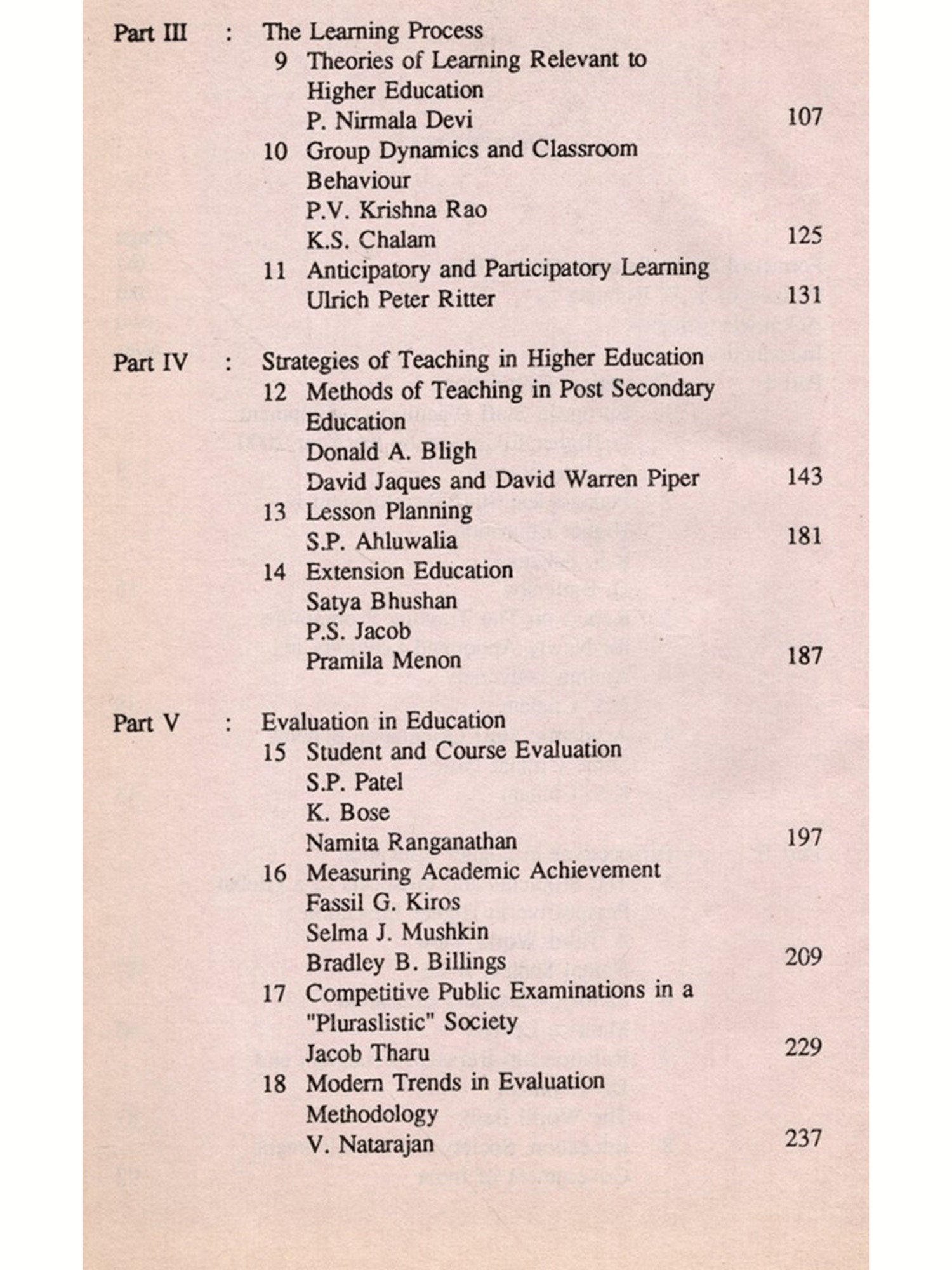 The present anthology of articles was selected by the author to meet the needs of the Academic Staff Colleges. There are seven sections in the volume. The editor has taken care to include material relating to the three important components of the scheme. First, the theoretical foundations of the scheme both from the Western and Asian experiences have been provided. This is followed by the Socio-economic and philosophical perspectives in higher education. As the understanding of the process of learning is basic to a teacher, special contributions have been included in a separate section in this volume. The pedagogy of higher education has been provided in a detailed manner. The methods and techniques of evaluation in education are being given importance in the volume by incorporating a survey paper on methods of measuring academic achievement in the Third World countries. Academic administration and management of colleges and universities are examined by experts in the field in the last part of the anthology. A long term perspective of the academic functions of higher education is also given in the volume. Thus, the book covers the broad areas of the Academic Staff Orientation Scheme and hopefully will prove useful for the participants of the scheme.