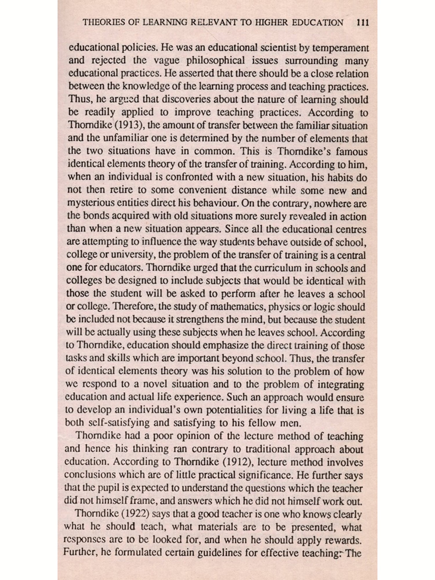 Understanding the learning process is a prerequisite for any pedagogical development. There are certain theories of learning which are relevant to higher education. The teacher in higher education must understand the group dynamics of adults so as to systematically manage the classroom situation. There are theories of anticipatory and participatory learning which need to be understood to make the profession of teaching a creative activity. The contributions to the section on 'the learning process' concentrate on the basic theories of learning.