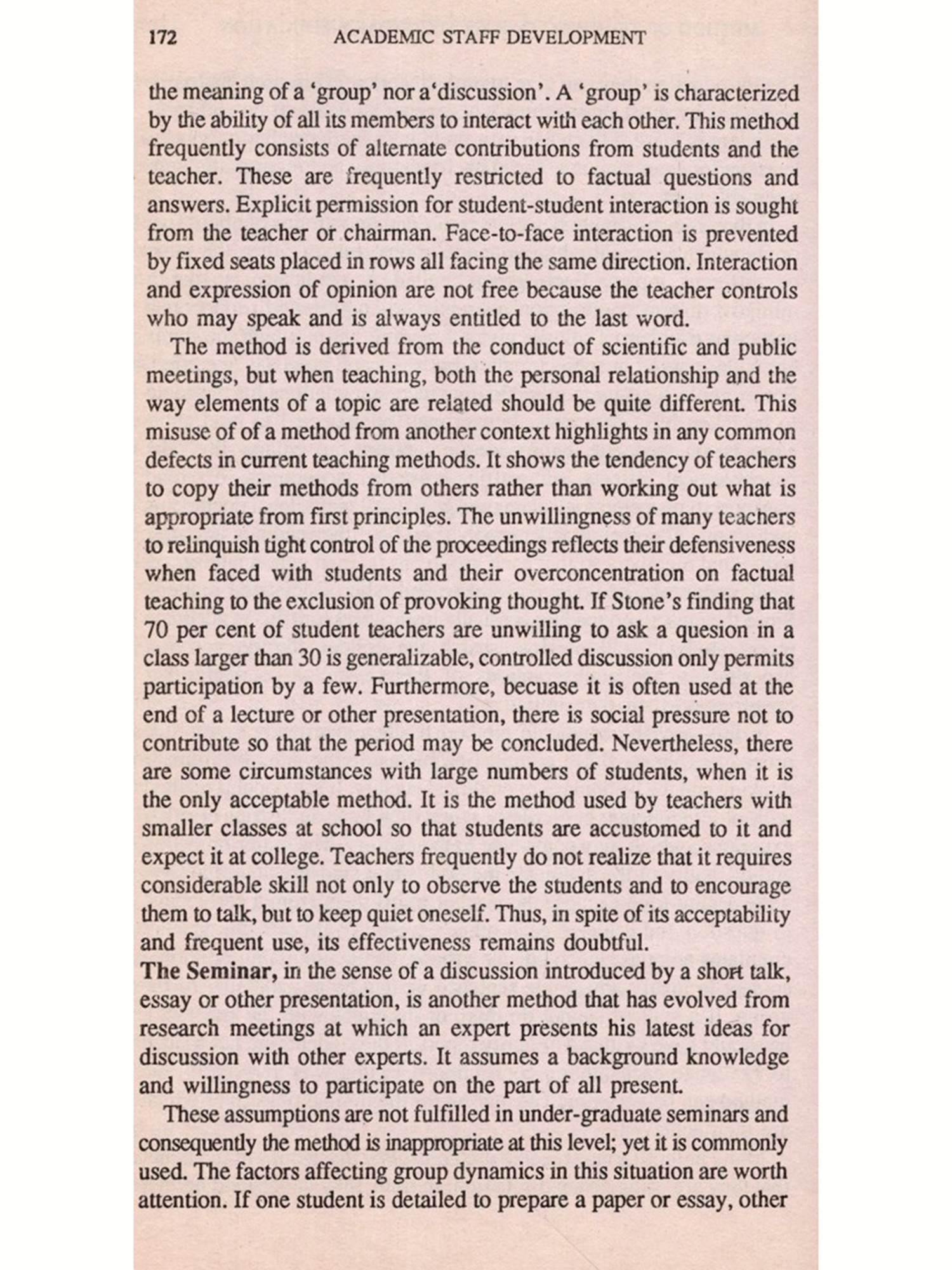 Obviously, the important function of a teacher in higher education is teaching. He should know how to develop innovative methods of teaching; particularly the samll group and the lecture methods in the colleges and universities. It is essential that the teachers in the higher educational institutions should be made to know the availability of various methods through which knowledge can be disseminated and new ideas imparted to the adult learners. The knowledge in the techniques of preparing a lesson plan will enable the teacher to deliver the lesson systematically and effectively in the classroom. Extension education has been accepted now as a social mission of institutions of higher learning in India. It has been used to make higher education socially relevant. It also comes under the broad category of 'project-method of teaching. The teachers will be benefited if the contours of this method are known to them. This section on 'the strategies of teaching is concentrated on the survey of the methods of teaching in post secondary education. They pointed out the diversity in higher education for experimenting with innovative methods of teaching.
