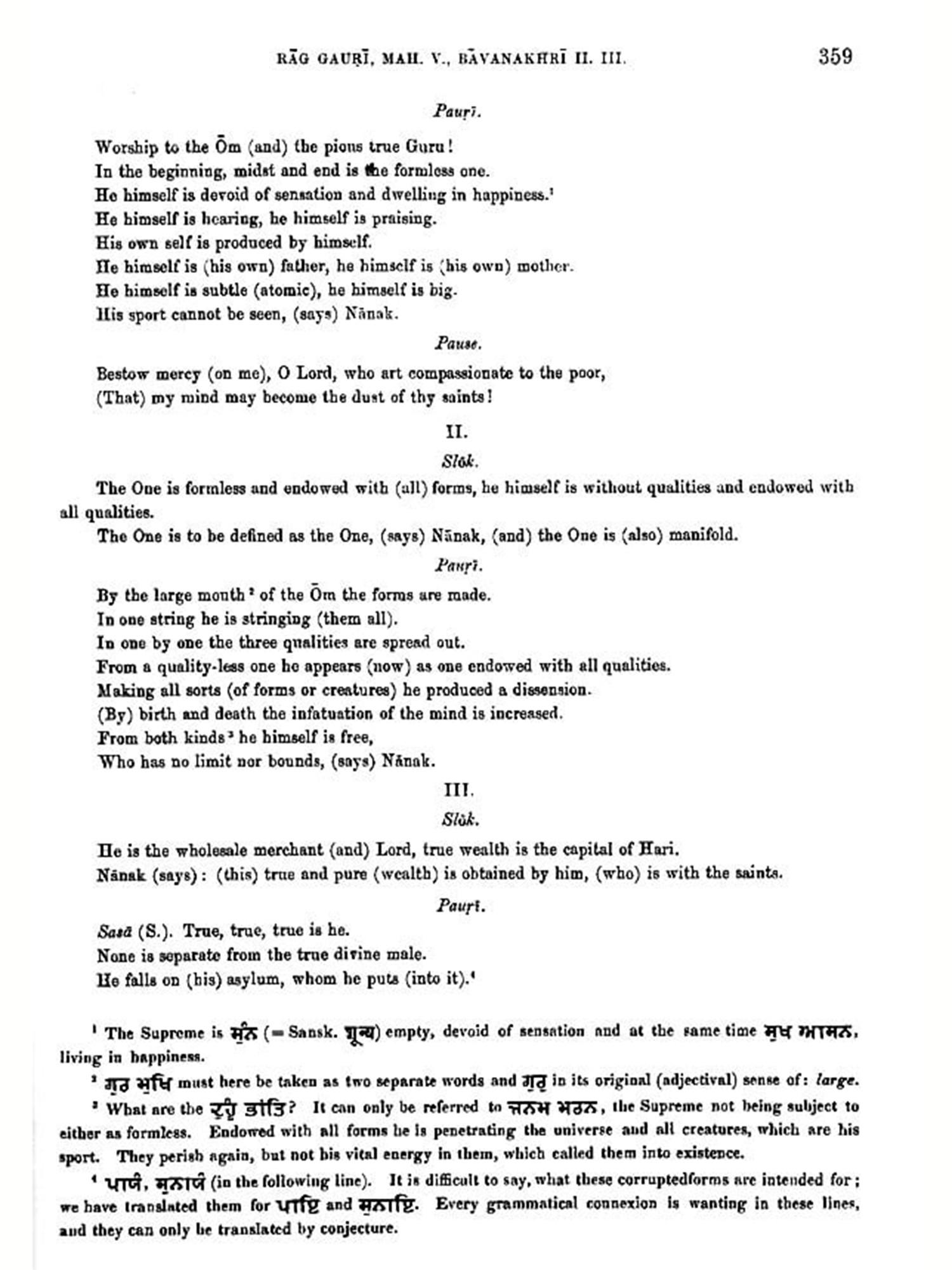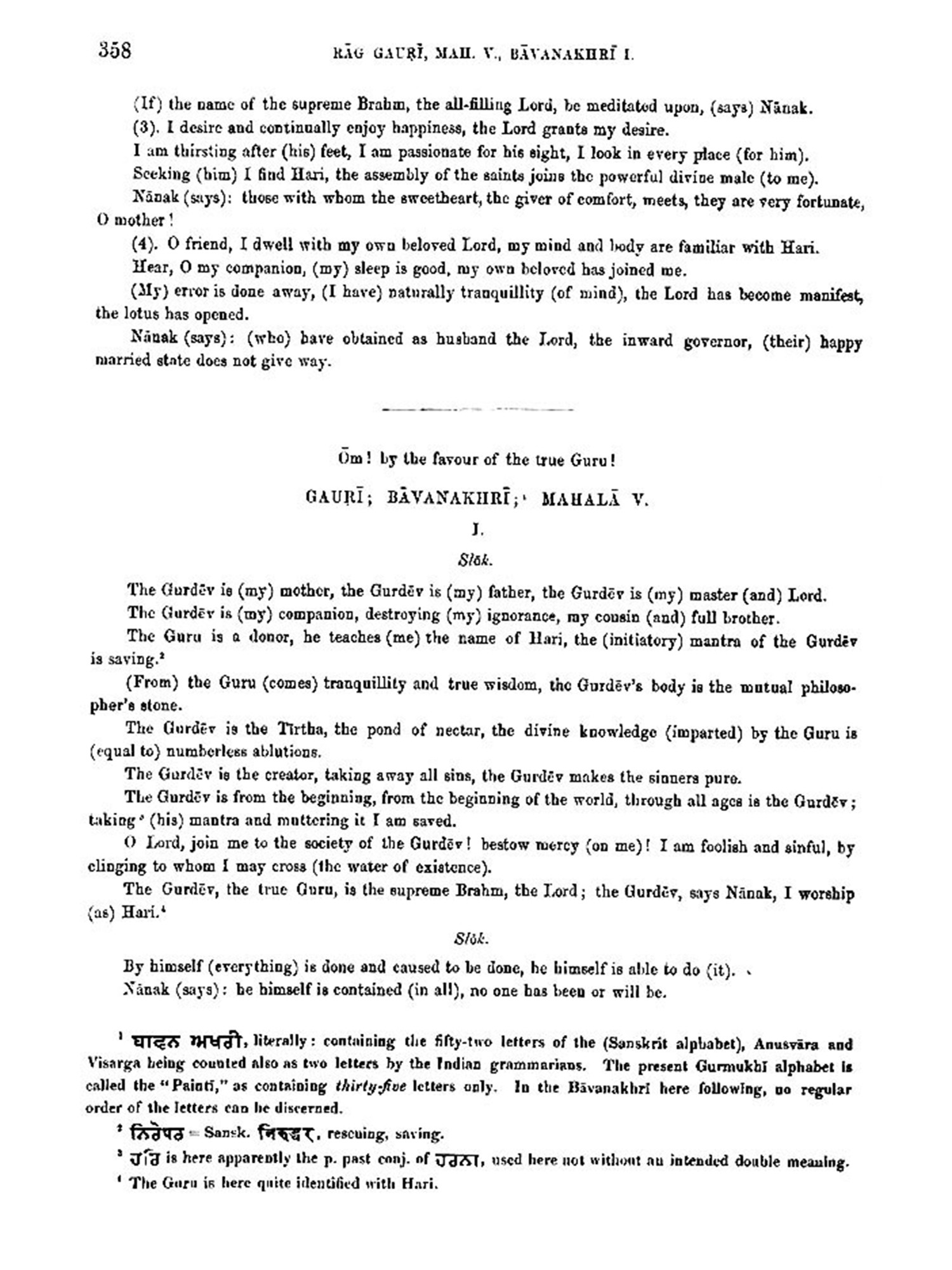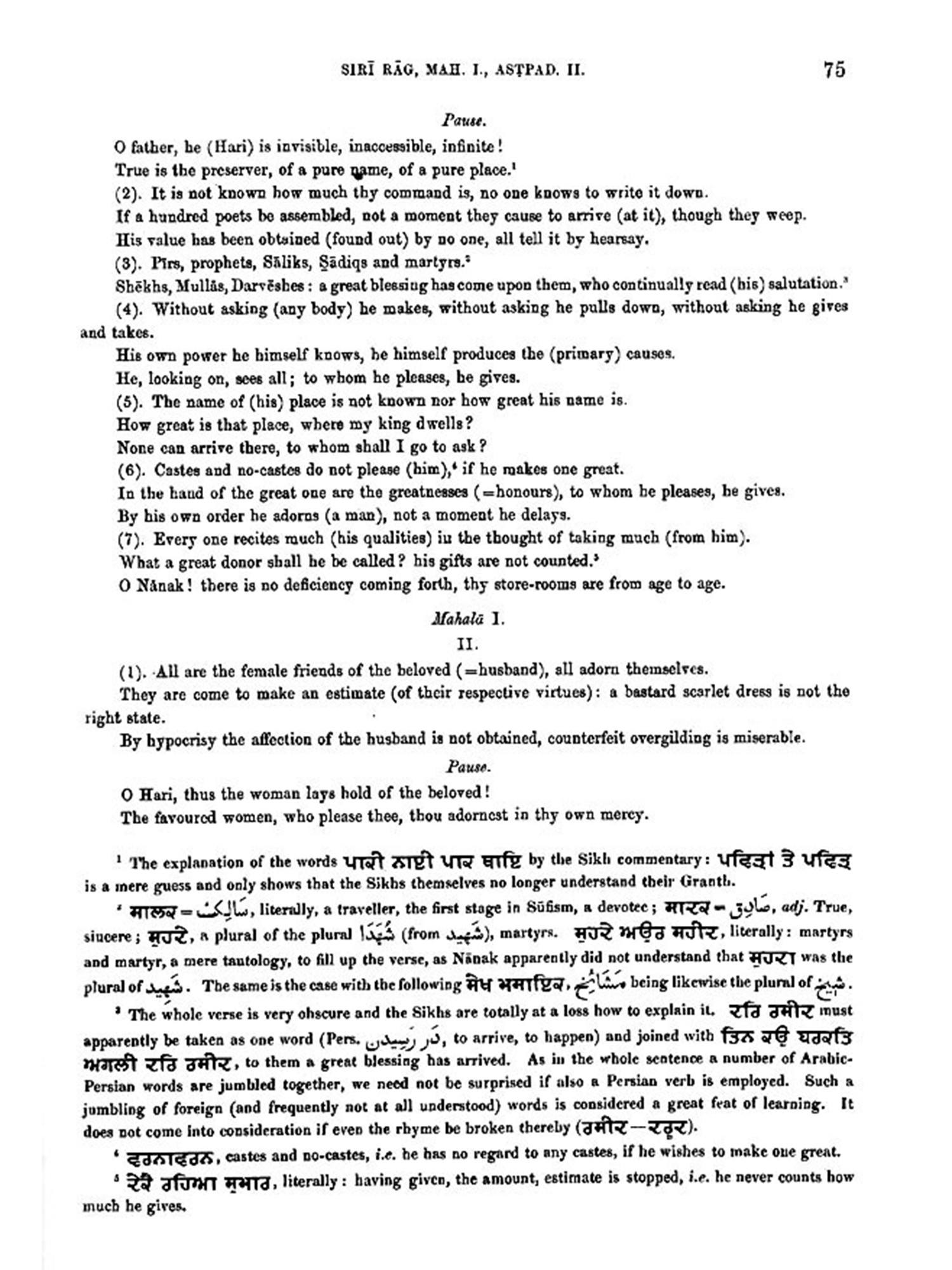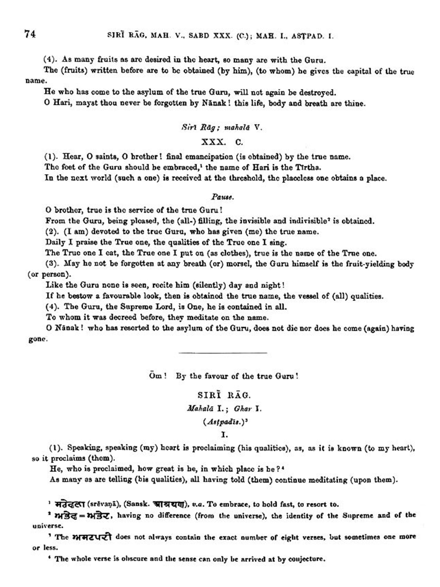 The work was entrusted to me by the India Office authorities towards the end of the year 1869, in the expectation that the translation could be made at home. But after I had fairly taken up the task, I soon perceived, that in spite of my knowledge of the modern North-Indian vernaculars, which I had formerly acquired in the country itself, and of Sanskrit and Prakrit, it was next to impossible to make a trustworthy translation of such a difficult book, as the Sikh Granth proved to be, without native assistance. There existed neither a grammar of the old Hinduī dialects nor a dictionary, and though I was able to make out many obscure words by dint of careful comparison with the modern idioms and the Prakrit, yet there remained a considerable residuum of words and grammatical forms to which I could get no clue, being destitute of all literary means.