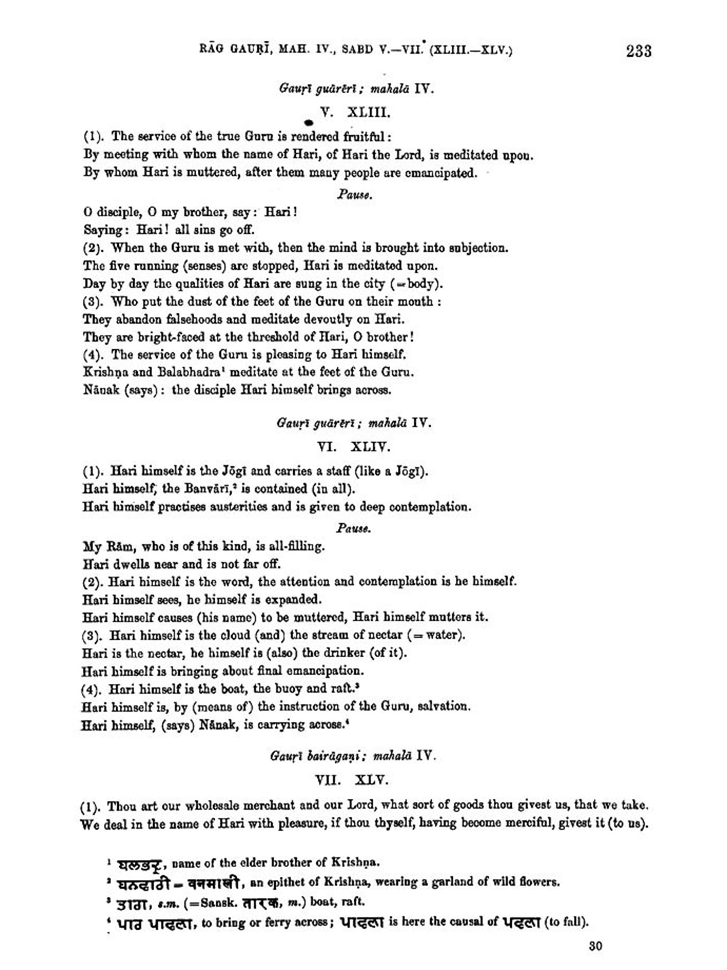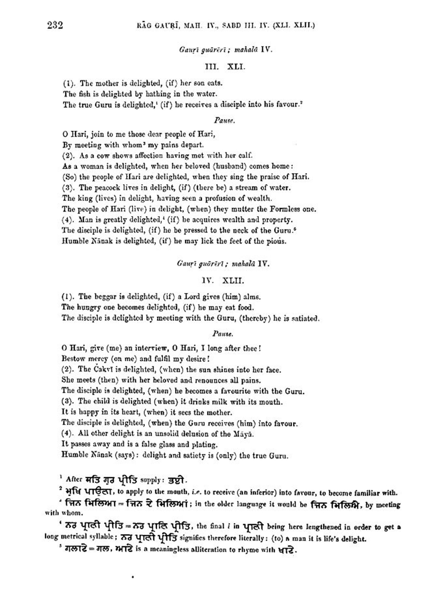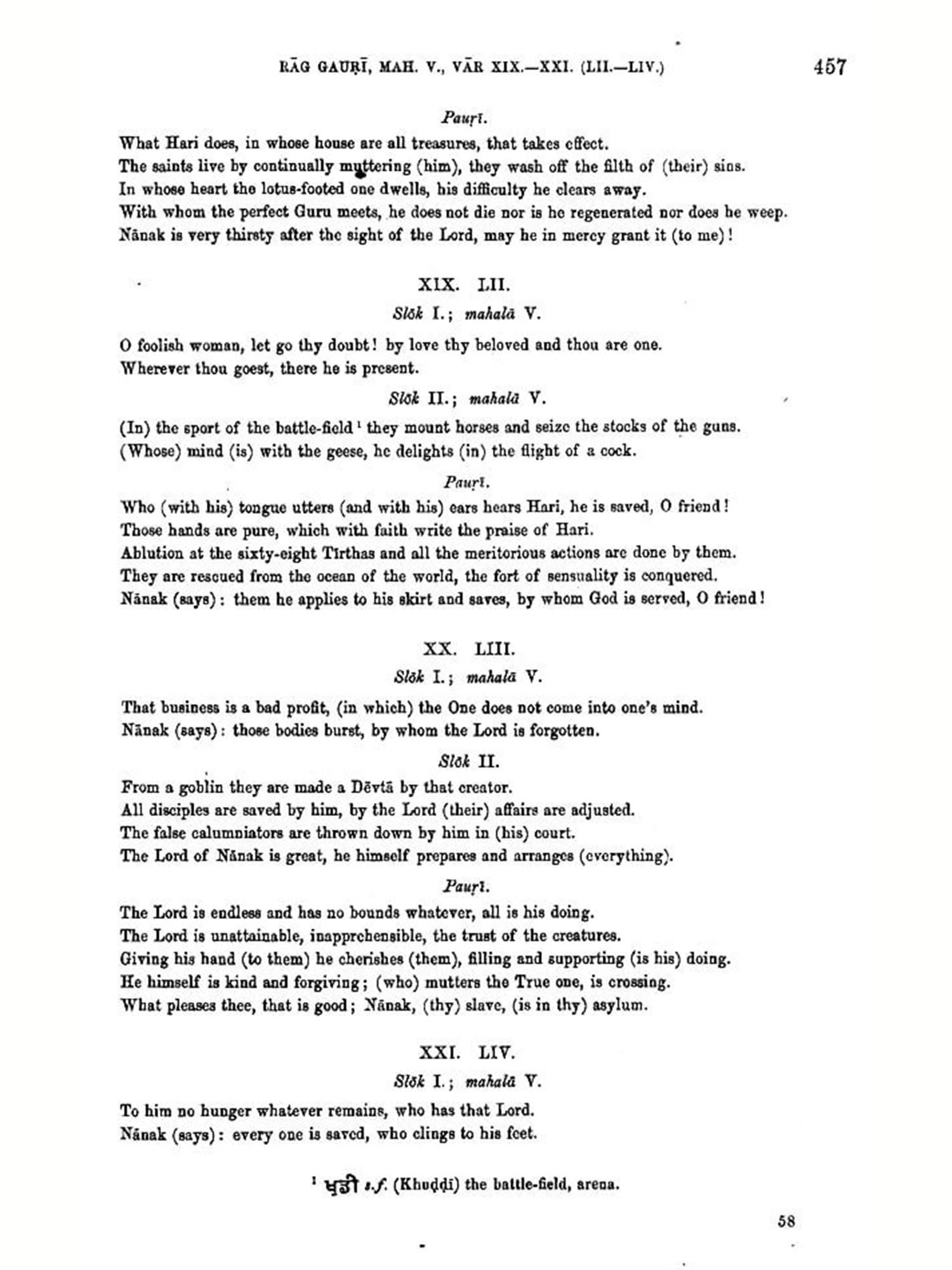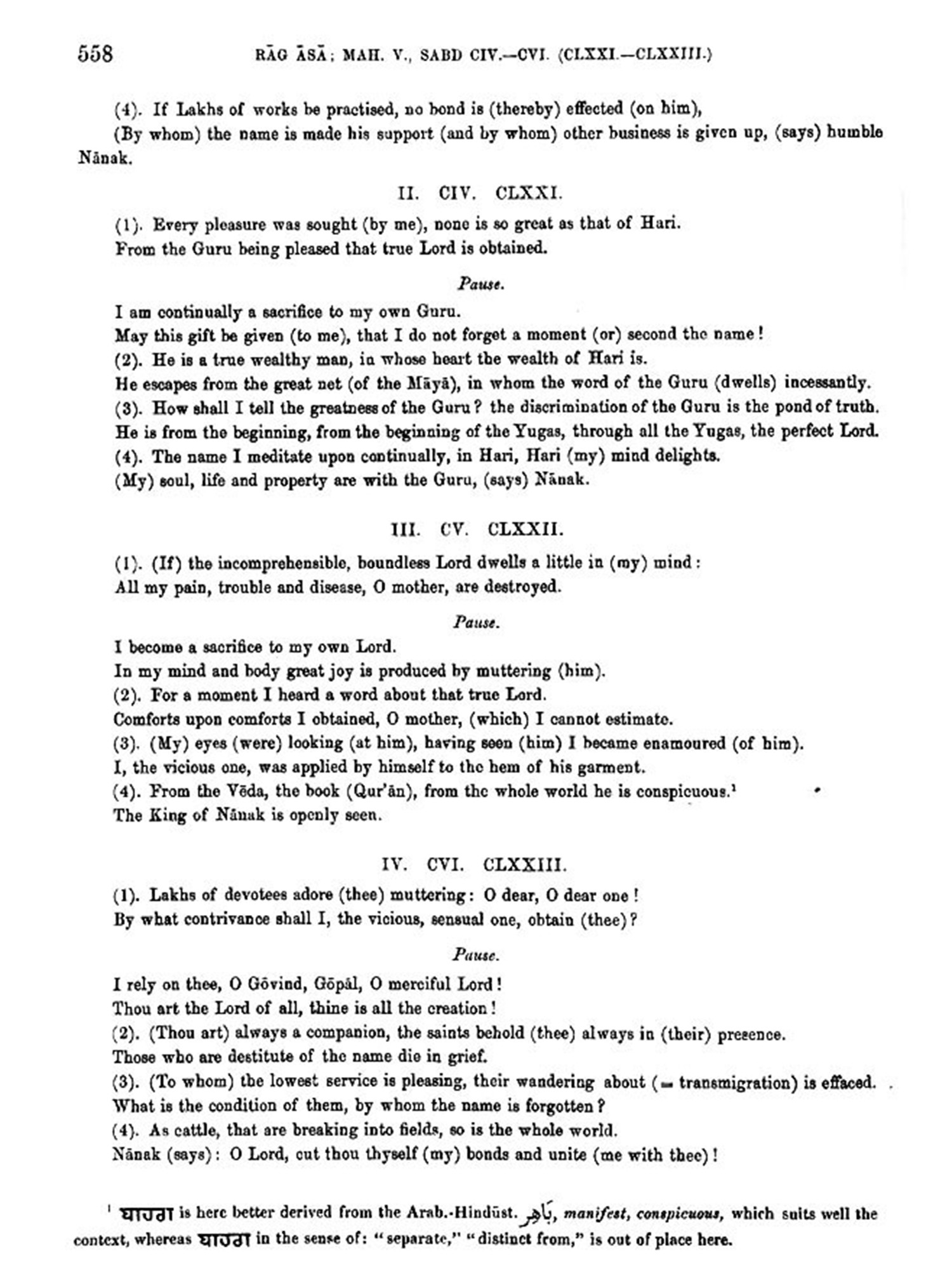 The work was entrusted to me by the India Office authorities towards the end of the year 1869, in the expectation that the translation could be made at home. But after I had fairly taken up the task, I soon perceived, that in spite of my knowledge of the modern North-Indian vernaculars, which I had formerly acquired in the country itself, and of Sanskrit and Prakrit, it was next to impossible to make a trustworthy translation of such a difficult book, as the Sikh Granth proved to be, without native assistance. There existed neither a grammar of the old Hinduī dialects nor a dictionary, and though I was able to make out many obscure words by dint of careful comparison with the modern idioms and the Prakrit, yet there remained a considerable residuum of words and grammatical forms to which I could get no clue, being destitute of all literary means.