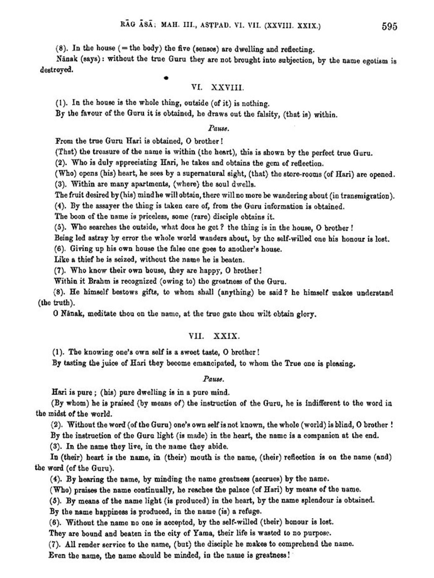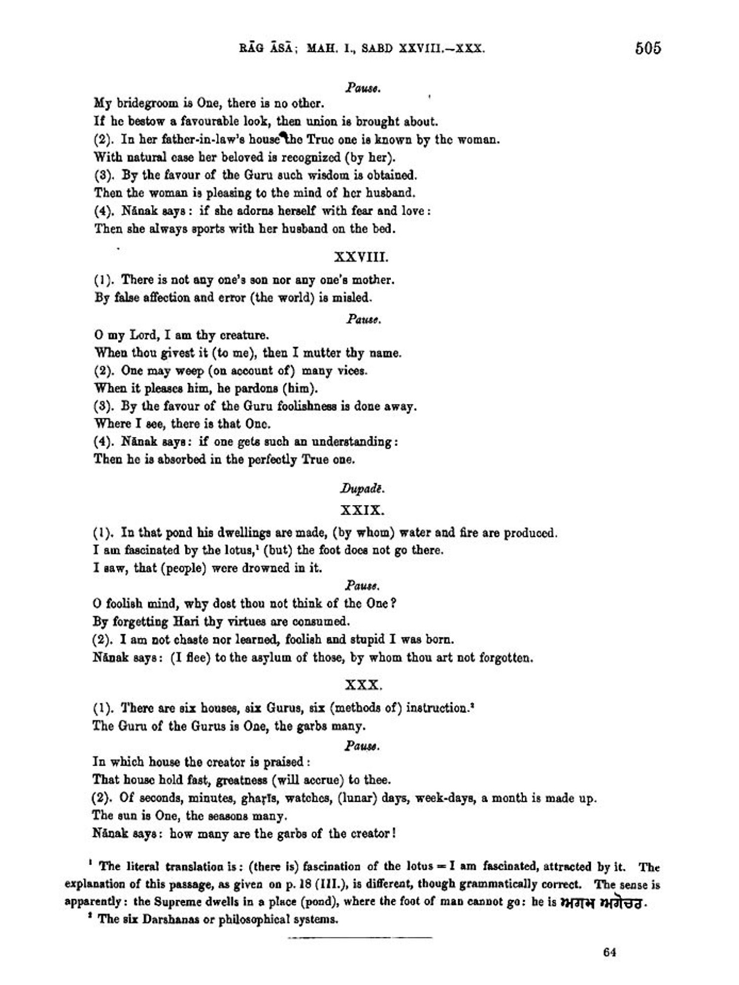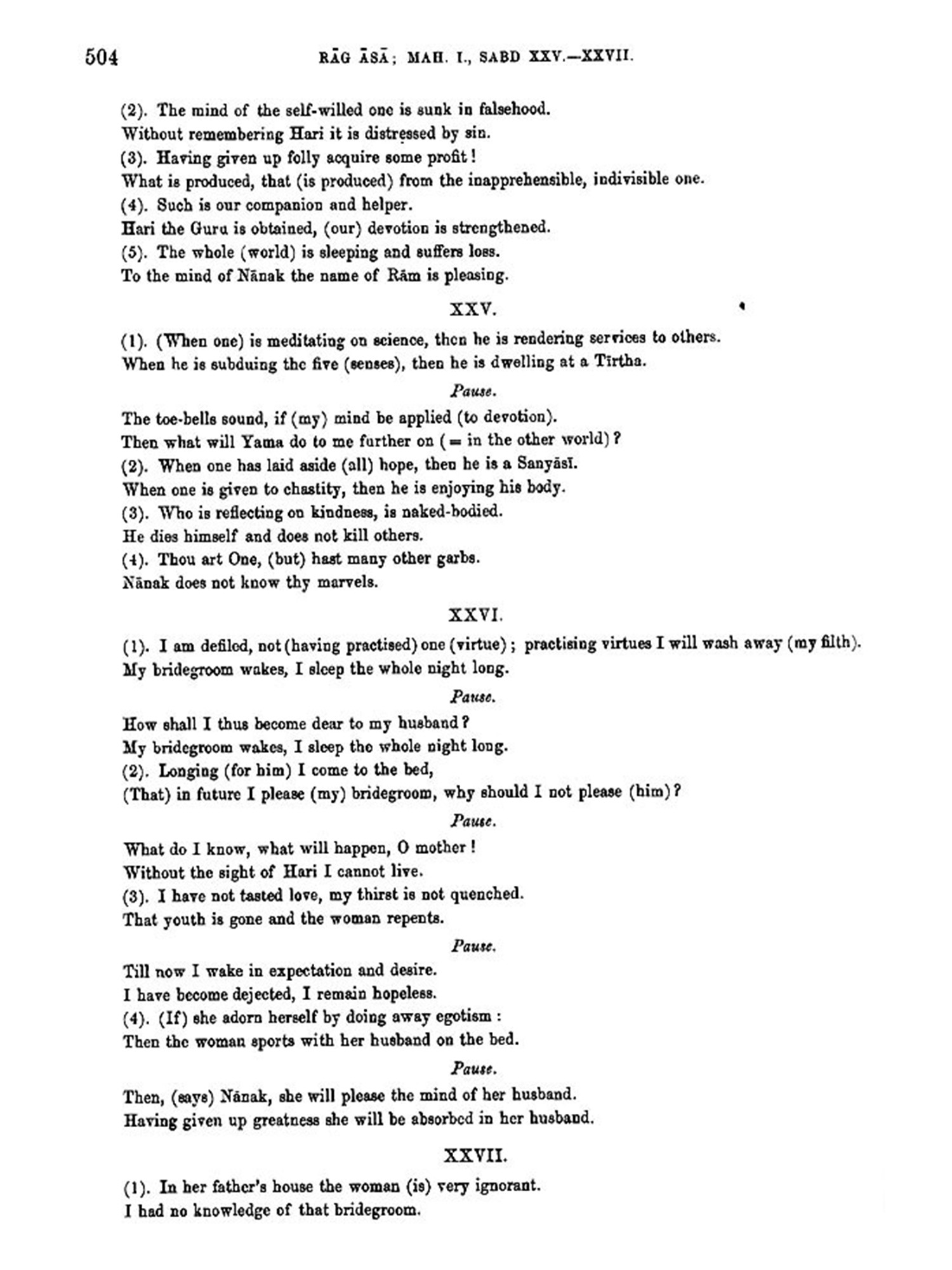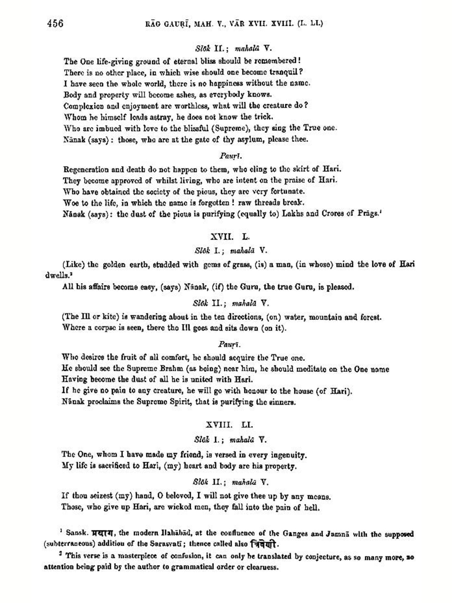 When I reported this circumstance to the India Office, considerable difficulties arose, as the original plan had to be changed; but it was finally arranged that I should go myself to the Panjab, in order to work first the Granth through with the aid of some Sikh Granthis. I started there-fore for India towards the close of the year 1870, in the expectation, that all difficulties would be easily surmounted there. But after I had succeeded in engaging two Sikh Granthis at Lahore, I was not a little surprised, when they declared to me, that the Granth could not be translated in the literal grammatical way I desired. I soon convinced myself, that though they professed to understand the Granth, they had no knowledge either of the old grammatical forms or of the obsolete words; they could only give me some traditional explanations, which frequently proved wrong, as I found them contradicted by other passages, and now and then they could give me no explanation whatever; they had not even a clear insight into the real doctrines of the Granth. Other persons, who were recommended to me for their learning, I found equally ignorant. I went oven to lay a number of difficult passages before some Granthis at Amritsar, but was like-wise sorely disappointed. Finally I gave up all hope of finding what I wanted, as I clearly saw, that the Sikhs, in consequence of their former warlike manner of life and the troublous times, had lost all learning; whereas the Brahmans, who alone would have had the necessary erudition to lend me a helping hand, never had deigned to pay any attention to the Granth, owing to the animosity which formerly existed between the Sikhs and the Hindi community.