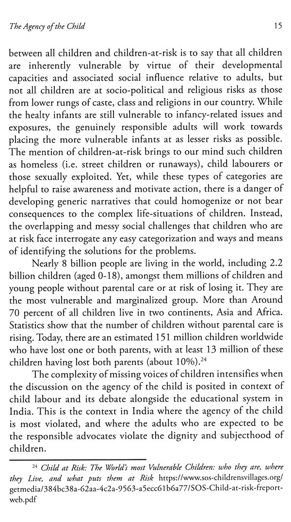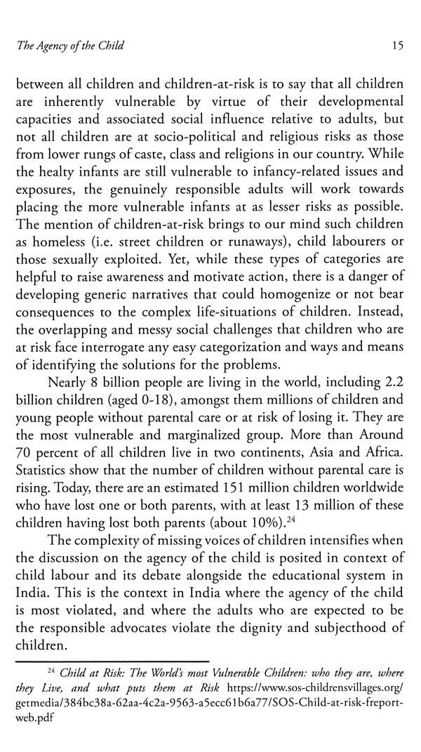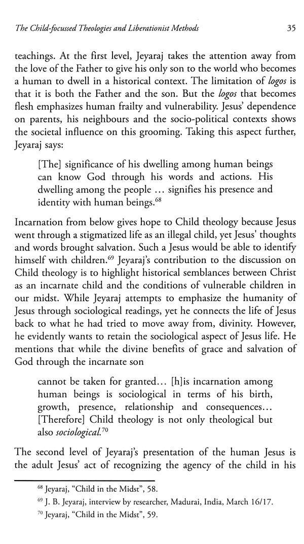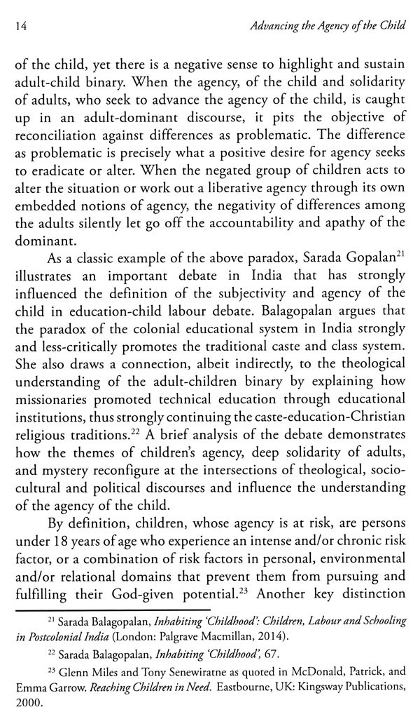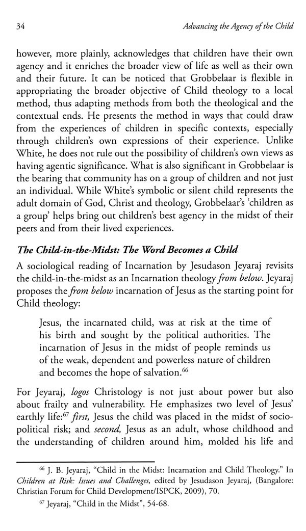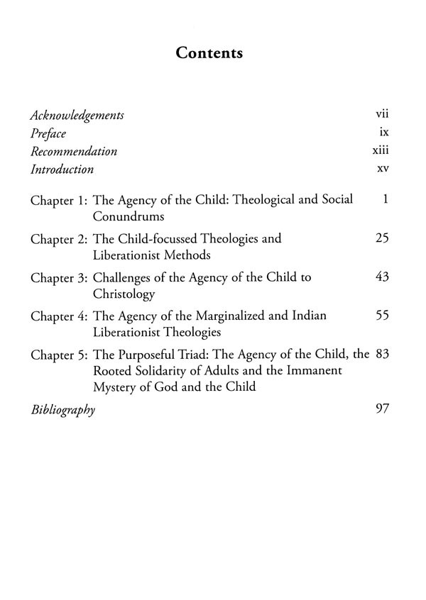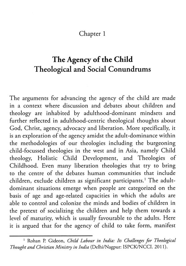 This work is a critical study of the inadequacies and untapped potentials of two methodological streams: methodologies of liberation theologies in India and methodologies of Child-focussed theologies in advancing an understanding of the agency of children. Liberation theologies in India have had reinvented liberationist principles to address the needs of dalits, women, tribals and adivasis.