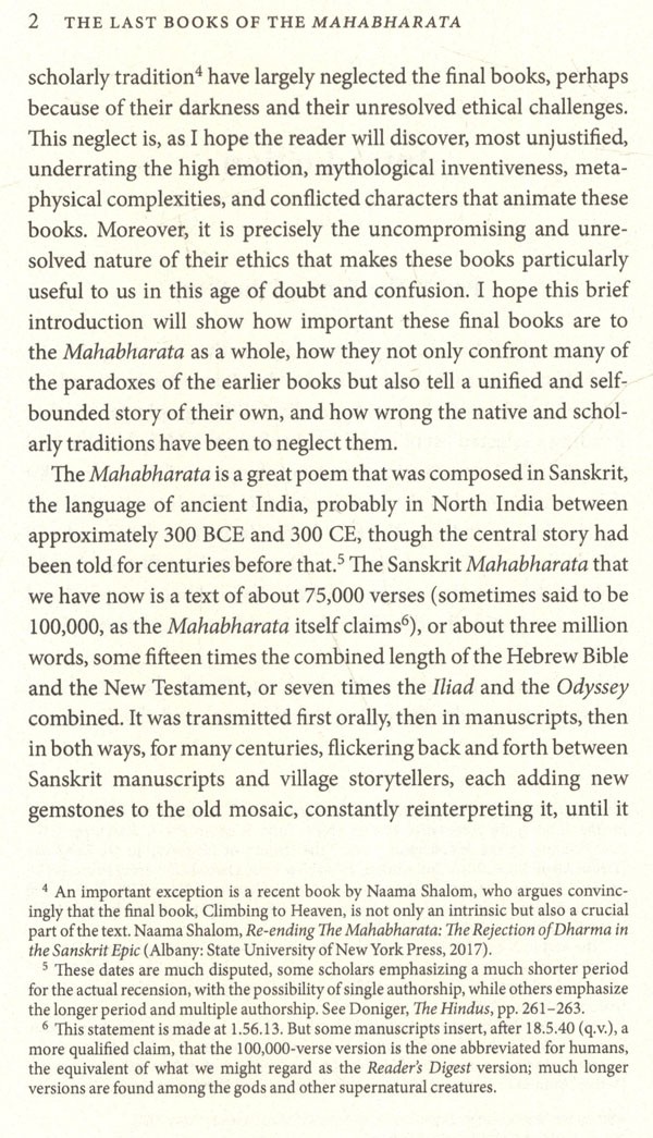 I must note in passing that both the South Asian tradition of retelling episodes from the Mahabharata and the European scholarly tradition have largely neglected the final books, perhaps because of their darkness and their unresolved ethical challenges. This neglect is, as I hope the reader will discover, most unjustified, underrating the high emotion, mythological inventiveness, meta- physical complexities, and conflicted characters that animate these books. Moreover, it is precisely the uncompromising and unresolved nature of their ethics that makes these books particularly useful to us in this age of doubt and confusion. I hope this brief introduction will show how important these final books are to the Mahabharata as a whole, how they not only confront many of the paradoxes of the earlier books but also tell a unified and self- bounded story of their own, and how wrong the native and scholarly traditions have been to neglect them.