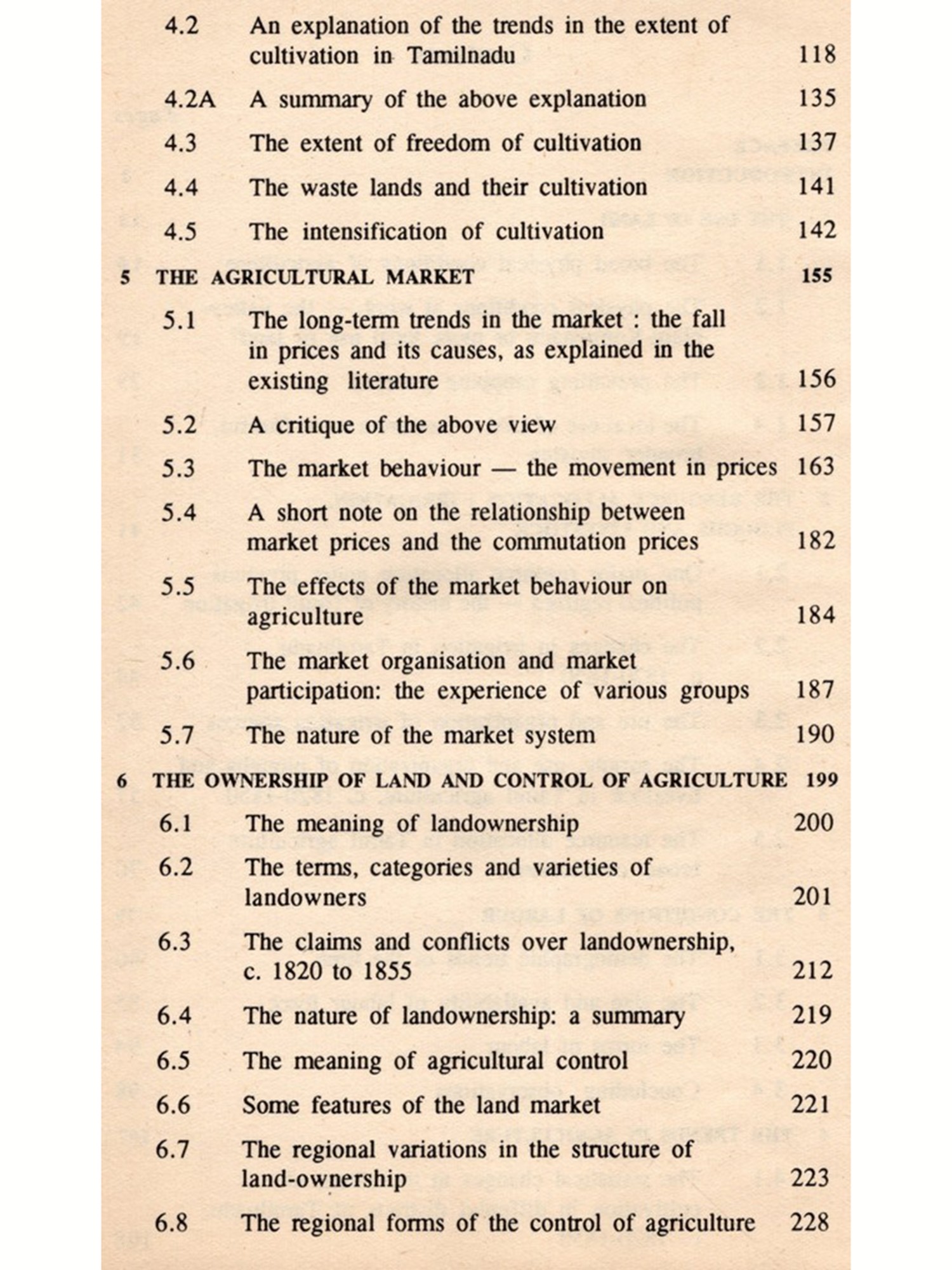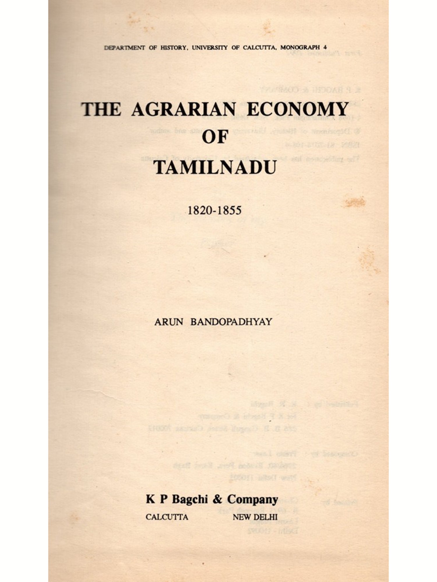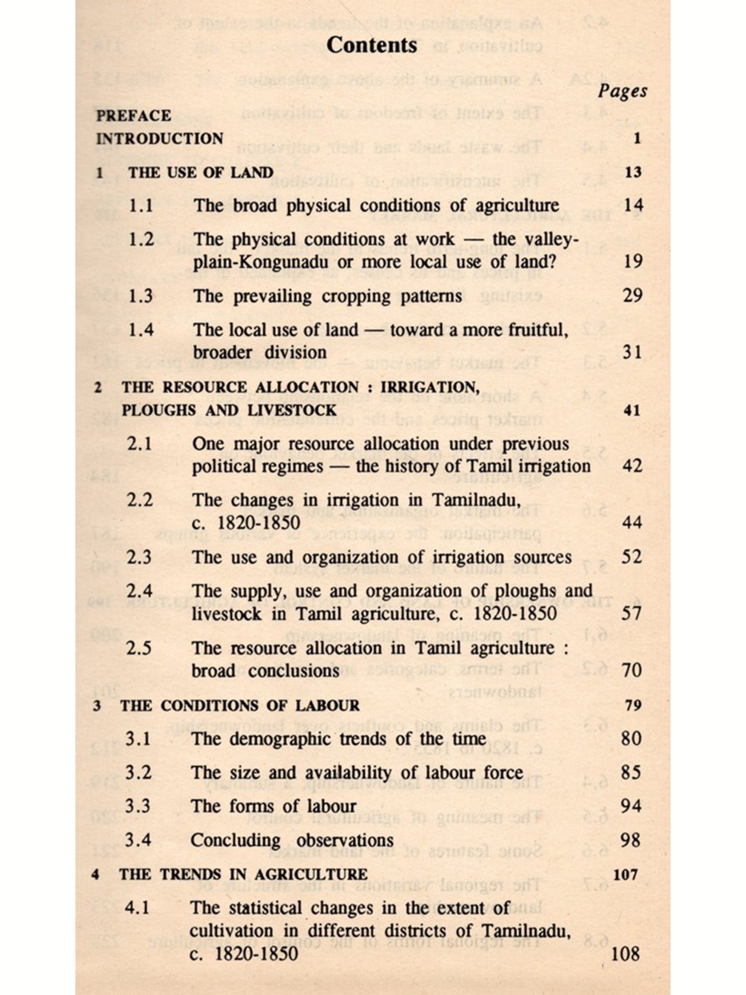 I feel hesitant to write about an academic interest which has been with me in various ways for about a decade and a half, despite many changes in the world of historical scholarship. I began with an intense feeling for agrarian history, to research about a region academically least covered and personally unfamiliar to myself. I thought much could be achieved if considerable quantitative and qualitative data about some of the crucial aspects of agrarian life can be collected, related to and interpretated. In the process I could possibly highlight some, became more familier to the region but at the same time got exposed to complexities unforeseen altogether. In the years that followed, my academic interest underwent significant changes, to pass through periods of involved research work, distraction and simple inaction, by dint of rethinking, redirection and revision. I now understand that my interest is a long-drawn-out process, leading me to a different cultural milieu, attendant with its joy and pangs, success and failures, my very desire to build grand projects and the limitation of my ability. The Agrarian Ecomomy of Tamilnadu is a half-way house between my present imagination and my initial expectation in research.