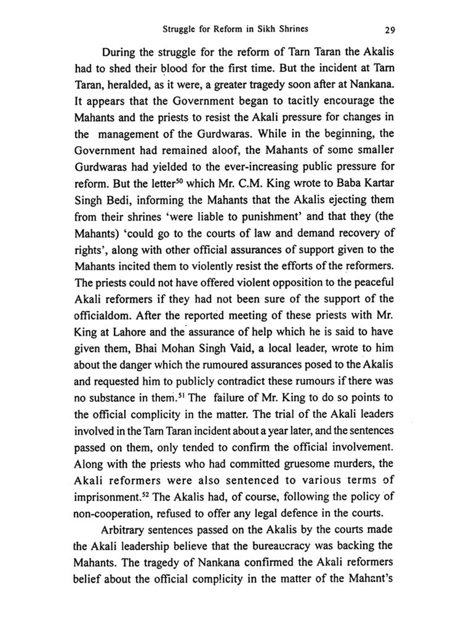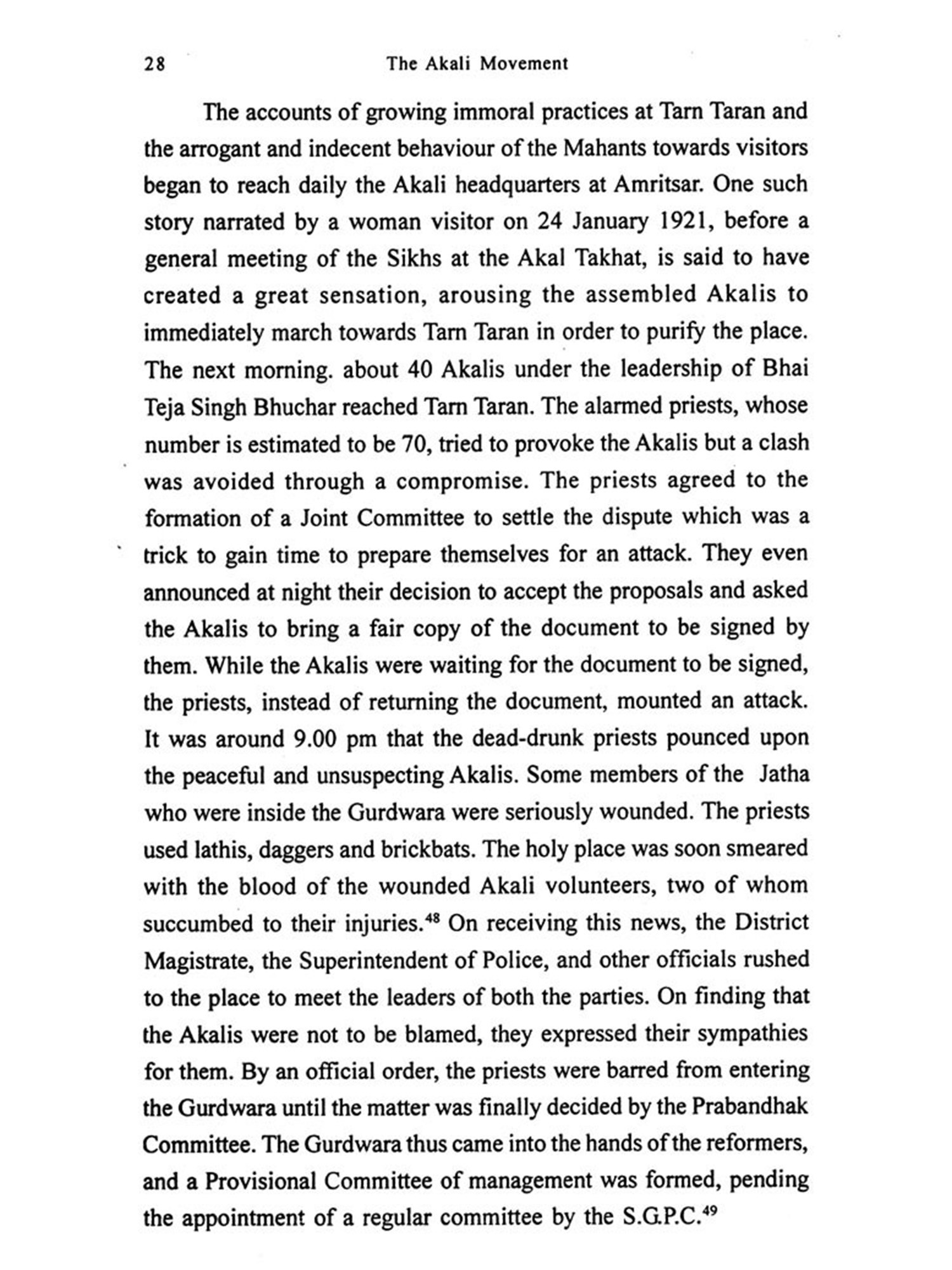 The extant literature on the Movement has not been able to do full justice to the subject as it has either ignored the Akali contribution to the political struggle in the country by depicting it as a 'mere movement of religious reform' or allowed the biased opinions of the authors to dominate their critical and objective judgement. With the exception of a well-known work in Punjabi, in which an attempt has been made to project the political aspect of the movement along with its religious achievements, the only two other important works are Teja Singh's Gurdwara Reform Movement and the Sikh Awakening and Ruchi Ram Sahni's Struggle for Reform in Sikh Shrines (edited by Dr. Ganda Singh). These depict only a part of the religious struggle with a some what pro-Akali bias.