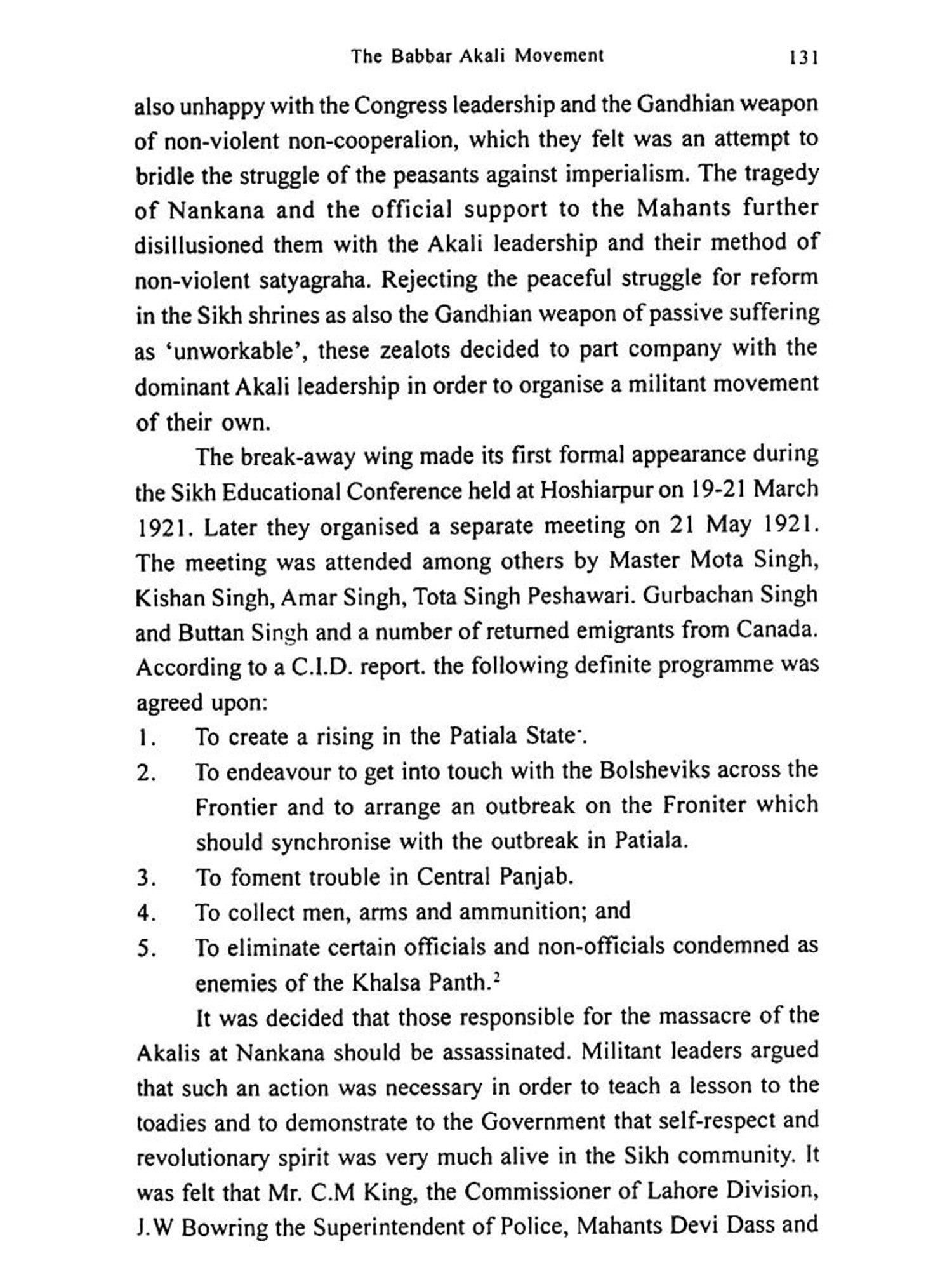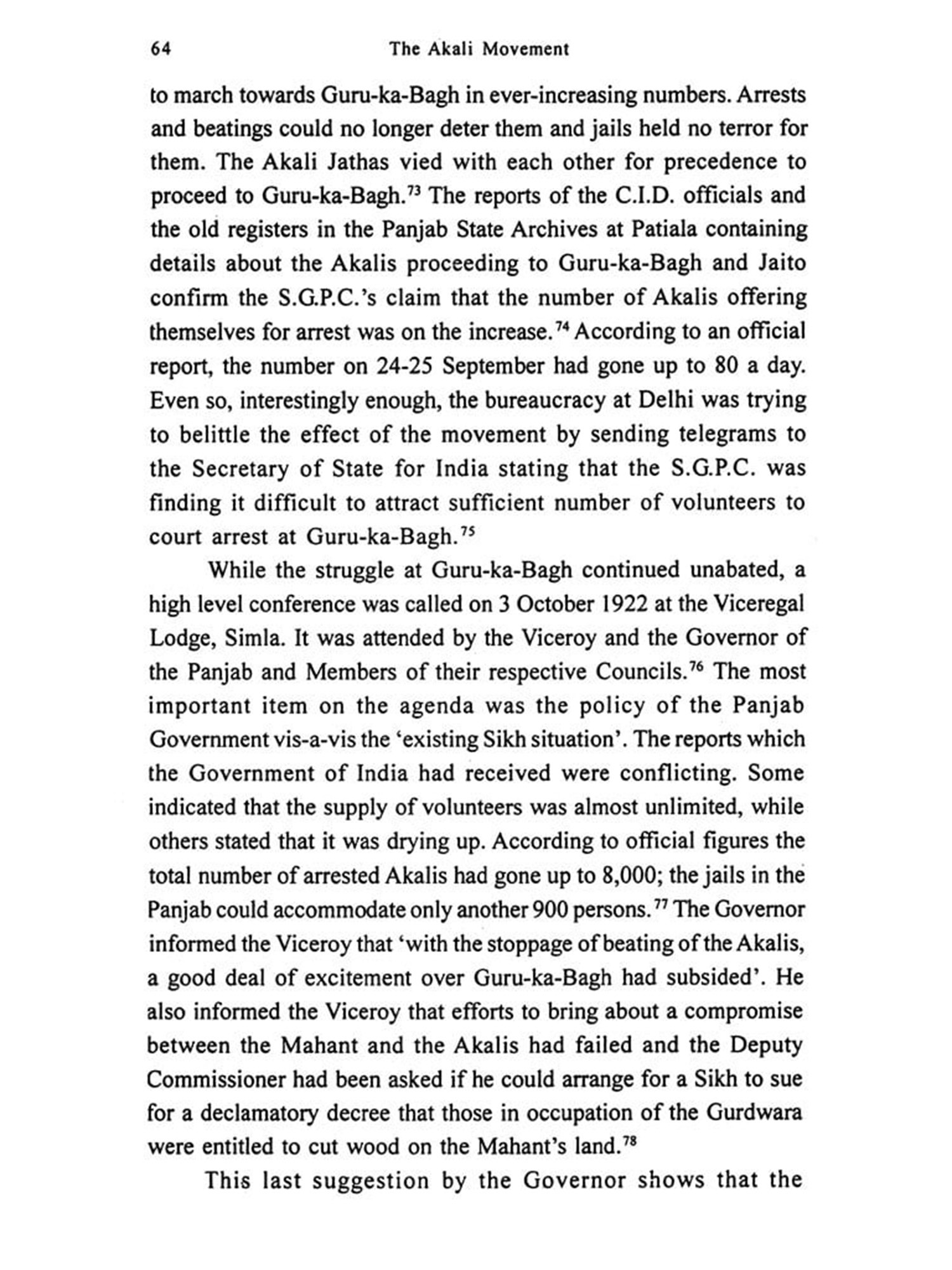 In the official records, C.I.D. reports, confidential memoranda and press communiques, etc., the Akali activities have either been underrated or overstated. On the one hand, the Panjab Government in its reports to the Viceroy of India described the situation in the province as 'normal and under control', while on the other, in order to justify its repressive measures against the extremists in the Akali camp, it charged them with 'entertaining political designs under the cloak of religion with the ultimate object of subverting the British rule and re-establishing the Sikh Raj. In spite of the Akalis amply demonstrating their strict adherence to the vow of non-violence at Nankana, Guru-ka-Bagh, Jaito and other places, and the Shromani Gurdwara Prabandhak Committee's open and repeated dissociation from the terrorist activities of the Babbar Akali militants, the official machinery continued to charge the Akali leadership with 'maintaining secret contacts with the authors of Babbar outrages and with having associations with the revolutionaries in Bengal, Afghanistan, Turkey and the Communist International.