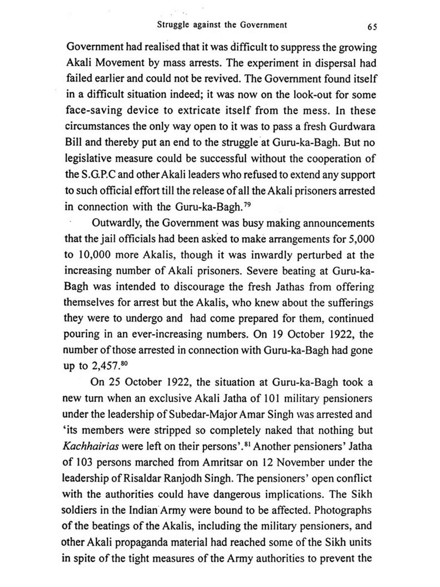 The Akali Movement was the first successful demonstration of passive resistance organised by the Sikhs to dislodge the Mahants, priests and other vested interests from the Sikh shrines. It was in the wake of the Akali Movement that the sturdy Sikh peasantry came out in the open against the foreign rule by initiating a frontal attack on the bureaucracy in the province which was working hand-in-glove with the vested interests. An interesting feature is that the Sikhs, who joined National Movement in the course of the Akali struggle and the Non-cooperation then launched by Mahatma Gandhi, courted arrests in a strength equal to that of the Congress and the Khilafat volunteers put together. The sacrifices they made were also far greater. Then again, the Akalis continued their non-violent struggle even after suspension in 1922 of the Non-cooperation Movement until they finally achieved their goal. The triumphant march of the Akali Jathas and their victory in the Keys' Affair was hailed by Mahatma Gandhi as the 'first decisive victory of the forces of nationalism."