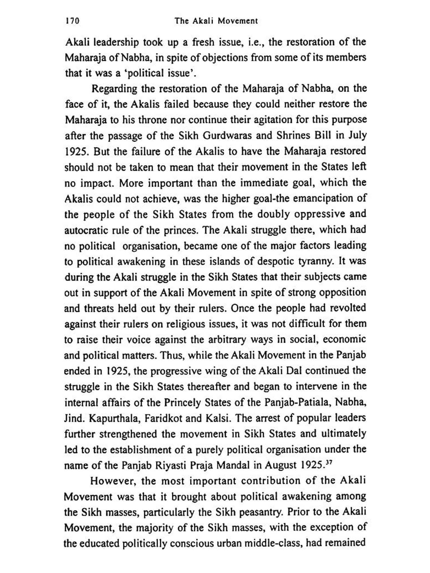The work tries to explain the essentially non-violent nature of the Akali Movement. The study shows how the Akali leaders in the past succeeded in channelising the popular religious upsurge during the Movement (1920-25) into a powerful instrument for India's struggle for freedom and brought the Sikh community into the mainstream of Indian nationalism. Three distinct features of the past struggle made it more effective than its later manifestations in the form of struggle for Panjabi Suba and more recent Akali agitation (1978-84). The first was that the Akali leadership realised the value of press and public opinion. They not only started an English daily The Hindustan Times, in addition to two vernacular papers, Akali (Urdu) and Akali te Pardesi (Punjabi), but also carried with them the non-Sikh population and the nationalist leadership. The second was that from the very beginning, they eschewed violence and quickly disowned the violent activities of the splinter group, the Babbar-Akalis. And thirdly the movement was never allowed to take a communal turn.