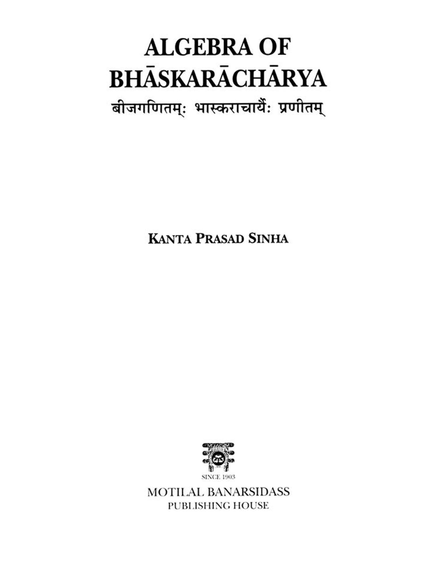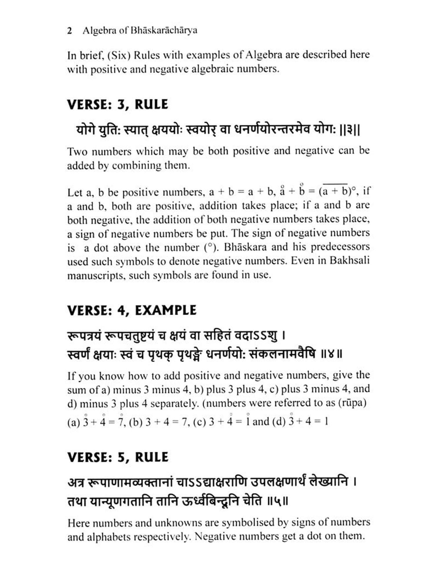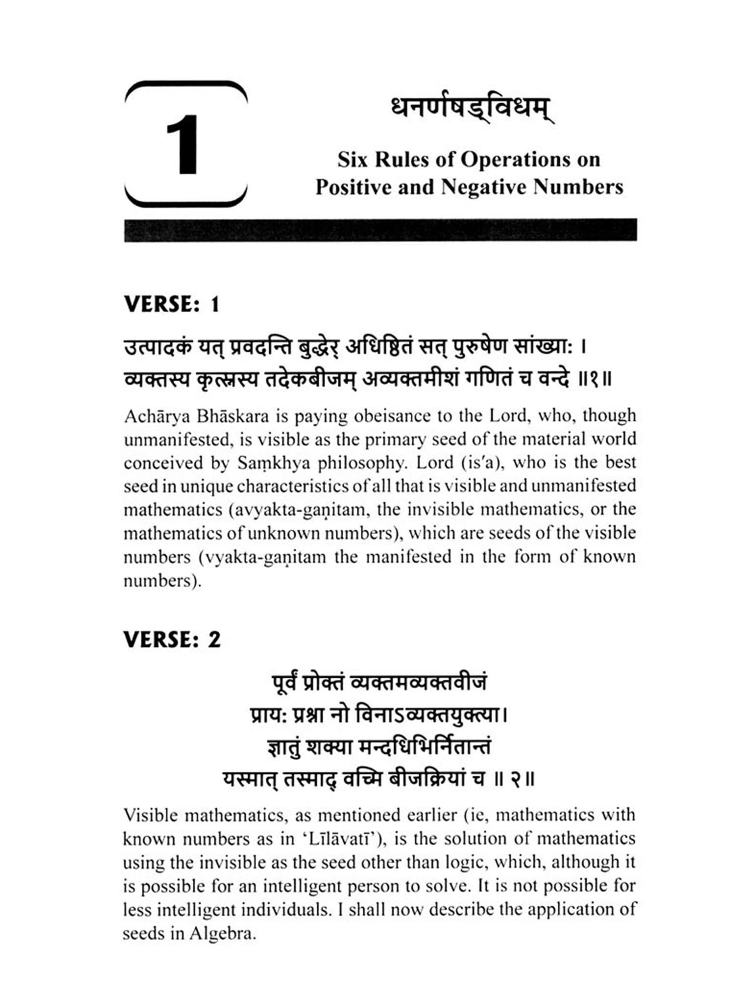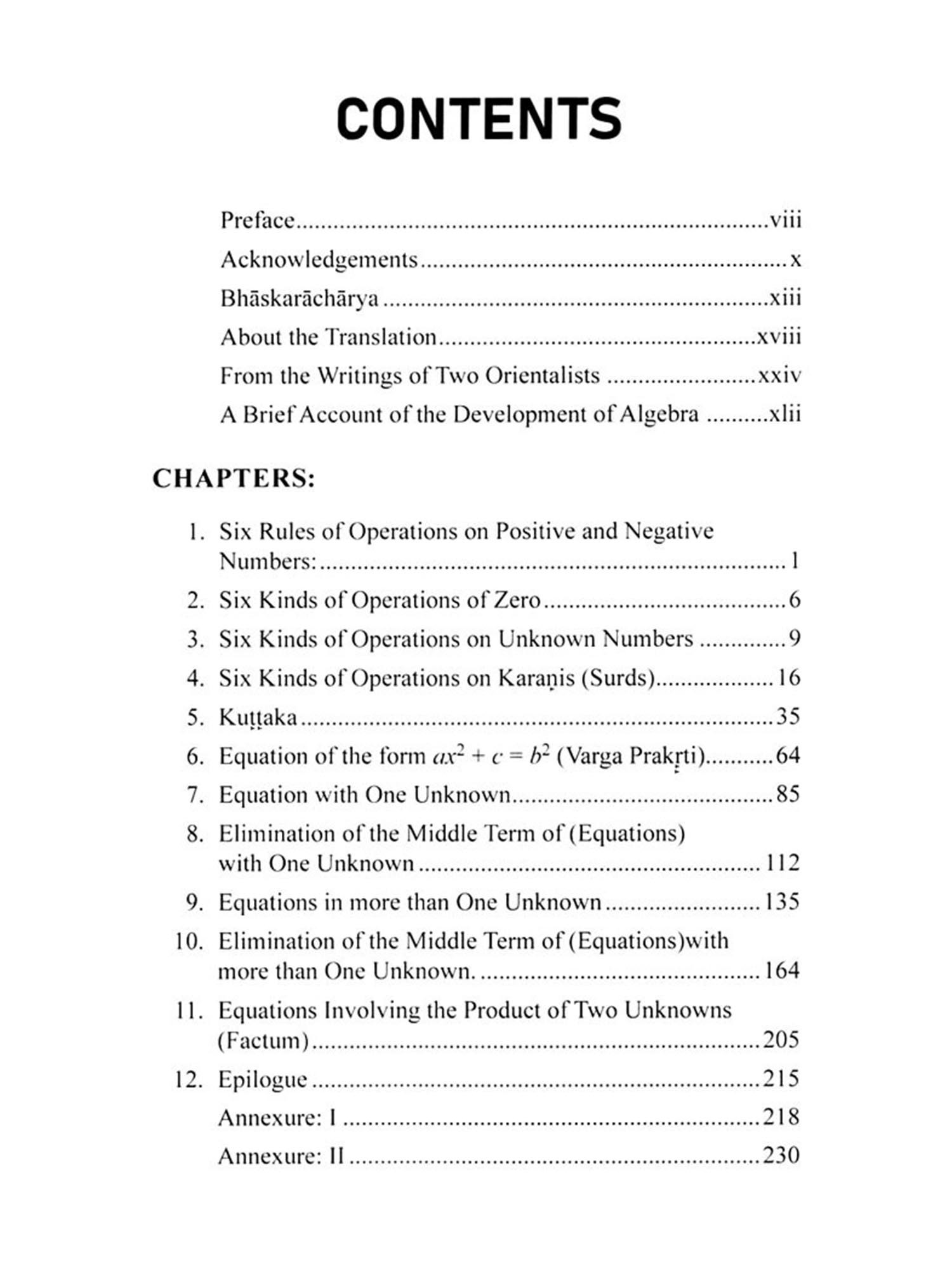 With the main text of English translation detailing explanation of Rules and Examples (solutions to problems), a brief account of the development of algebra across the civilisations in the ancient and medieval periods and its development in Greece, Arabs and India as observed by Edward Strachey and TH Colebrooke are placed. The purpose of such additions is to give the readers a balanced view of India's standing in the periods mentioned.