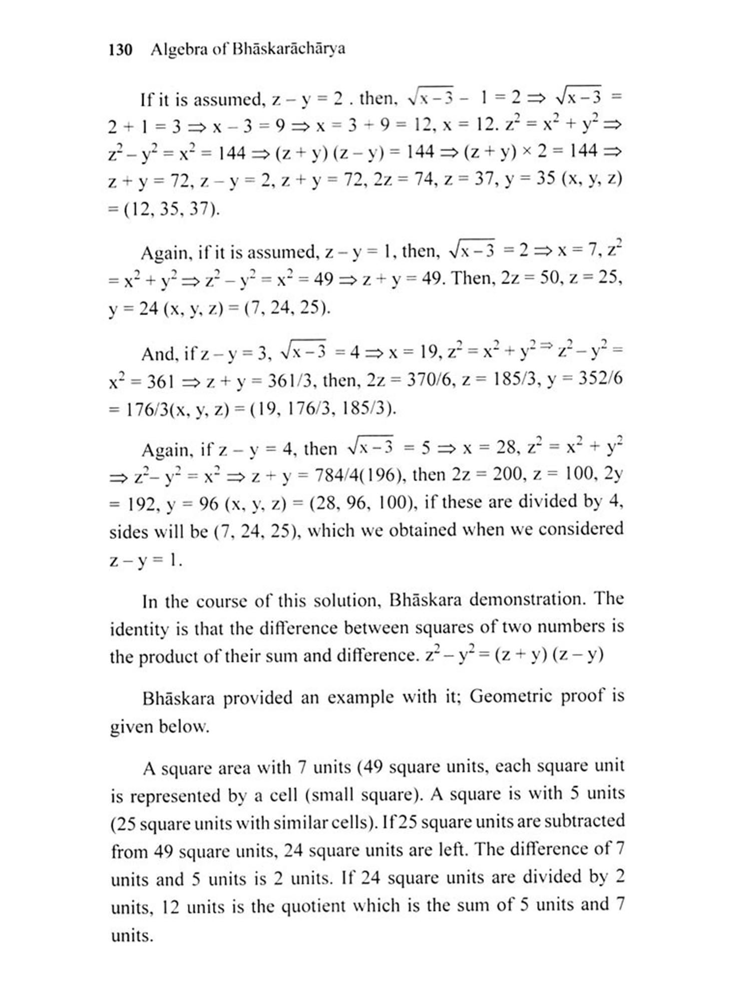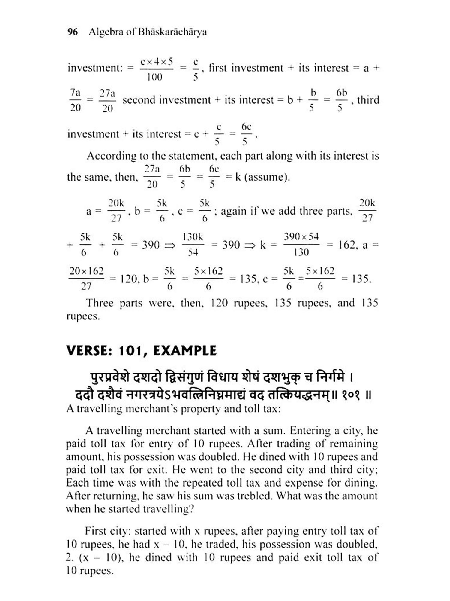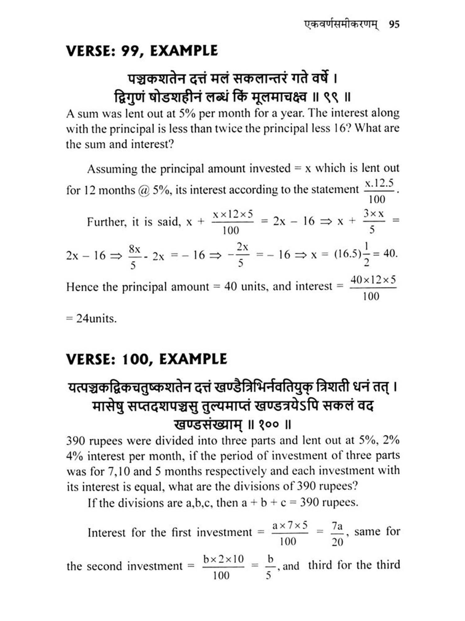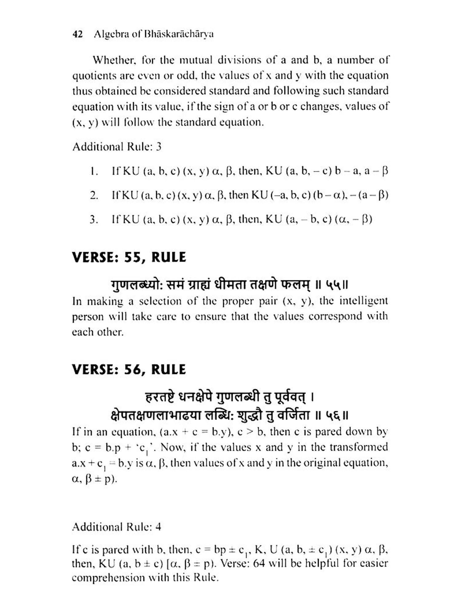 With the main text of English translation detailing explanation of Rules and Examples (solutions to problems), a brief account of the development of algebra across the civilisations in the ancient and medieval periods and its development in Greece, Arabs and India as observed by Edward Strachey and TH Colebrooke are placed. The purpose of such additions is to give the readers a balanced view of India's standing in the periods mentioned.