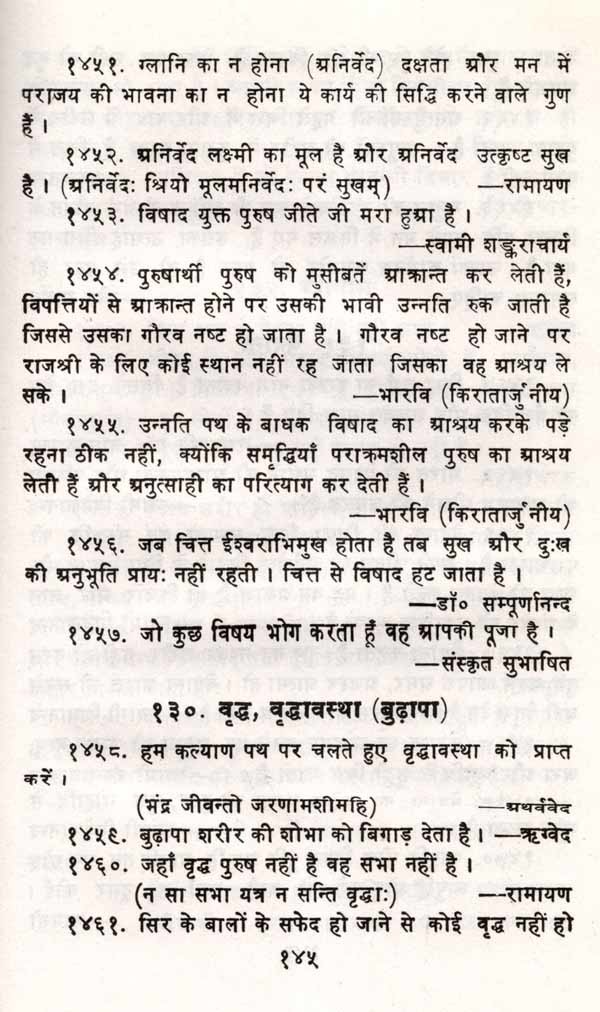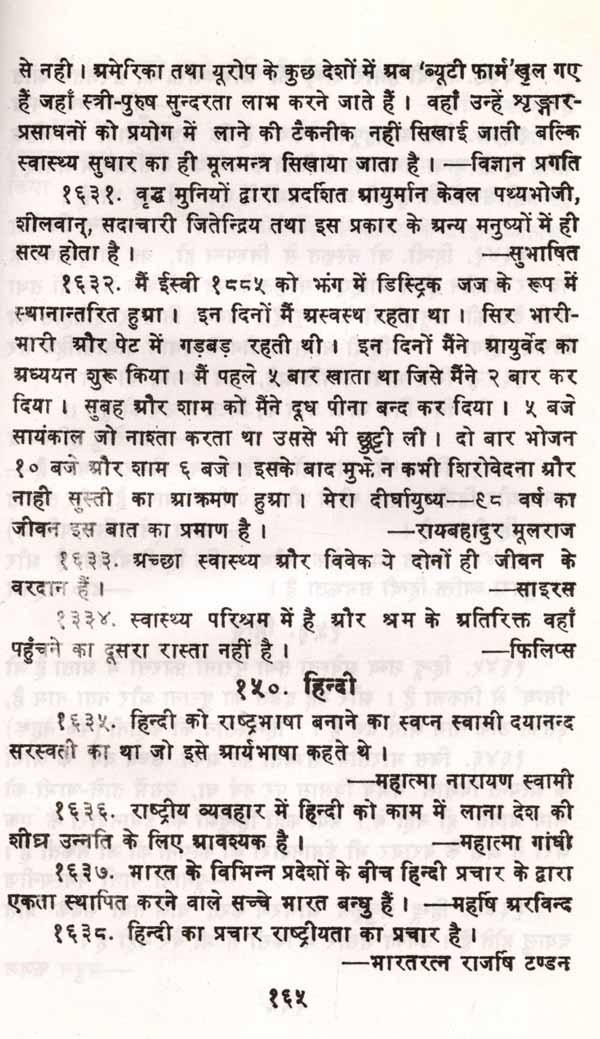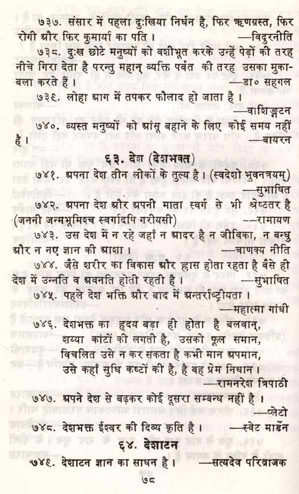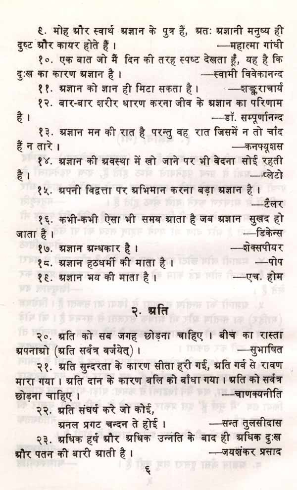 बहुत वर्ष पहले पं. हंसराज जी ने अपने वैदिक कोष में भिन्न-भिन्न विषयों पर वैदिक शब्दों के निर्वचन इकट्ठे किए थे जो वस्तुतः संकल्पनाए थीं। उससे शोध कार्यकर्ताओं को लगभग पाँच दशकों तक अचूक सहायता मिली। ऐसा ही प्रयास डॉ. सहगल का है। इस संग्रह में वैदिक ग्रन्थों से, रामायण, महाभारत योगवासिष्ठ श्रादि मौलिक ग्रन्थां से सूक्तियाँ संगृहीत हैं जो भारत के मूलाधार हैं। इन्हीं विचारों ने देश तथा संस्कृति की रक्षा की है। पुस्तक के अन्त में तीन सूचियाँ हैं (१) मूल श्लोक सुभाषितों की (२) ग्रन्थ तथा प्रन्यकारों की (३) तथा विषयों के अवान्तर विचारों की। इन सूचियों ने संग्रह को पुस्तक कहलाने योग्य सिद्ध कर दिया है अन्यथा यह विज्ञप्तिमात्र ही रहती। आज जव पी. एच. डी. शोध-ग्रन्थों के अन्त में सूचियों का अभाव है तब इसमें तीन सूची-रत्नों का समावेश श्लाध्य शृङ्गार है। इससे अनेक देशों की भाषाओं में बिखरे हुए विचारों का संगम होगा। प्राज हम यूरोप के विचार को जानते हैं परन्तु उत्तर भारत दक्षिण भारत के तमिल श्रेण्य ग्रन्थ 'सिल्पाधिकारम्' को नहीं जानता जो हमारी शिक्षा की विडम्बना है। केन्द्रीय हिन्दी निदेशालय को चाहिए कि अपने देश के विद्वात् कार्यकर्ताओं की खोज करके उनसे ऐसे ग्रन्थों का सम्पादन कराए जिससे देश की सांस्कृतिक एकता उत्तरोत्तर दृढ़ हो ।