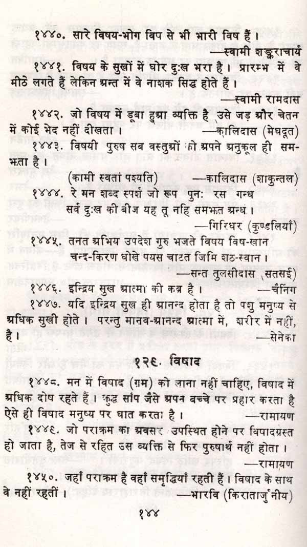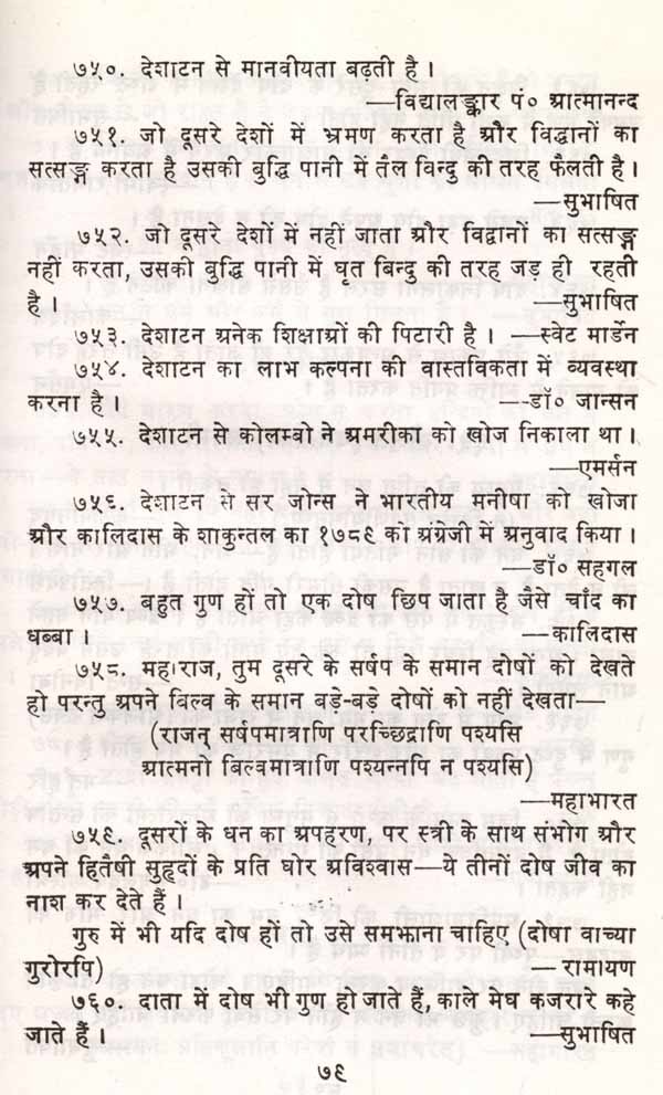 किसी विचार के विभिन्न पहलू शोधकार्य के लिए अत्यन्त उपयोगी होते हैं। उनके अभाव में विषय को अर्थवत्ता का अन्दाज सही नहीं लगाया जा सकता। जैसे काम (नं. ४२२) पर सूक्ति है 'काम यर्याप एक निकृष्ट नियामक है तो भी शक्तिशाली स्रोत है'। इसके विपक्ष में तुलसी की सूक्ति है (नं. ४१६) 'काम क्रोध मद लोभ सब प्रबल मोह की धार। तिन मंह अति दारुण दुःखद माया रूपी नार' । इसी तरह पाठक को यश (नं. ४४३) 'यश और सत्कर्म का सम्बन्व धुएँ और आग जैसा है' । विपक्ष में (नं. ४४७) 'यश वह प्यास है जो बुझाए पर भी नहीं बुझती' । इस प्रकार सम्पादक ने उभयपक्षों को देने में जो प्रयास किया है यह महत्वपूर्ण है ।