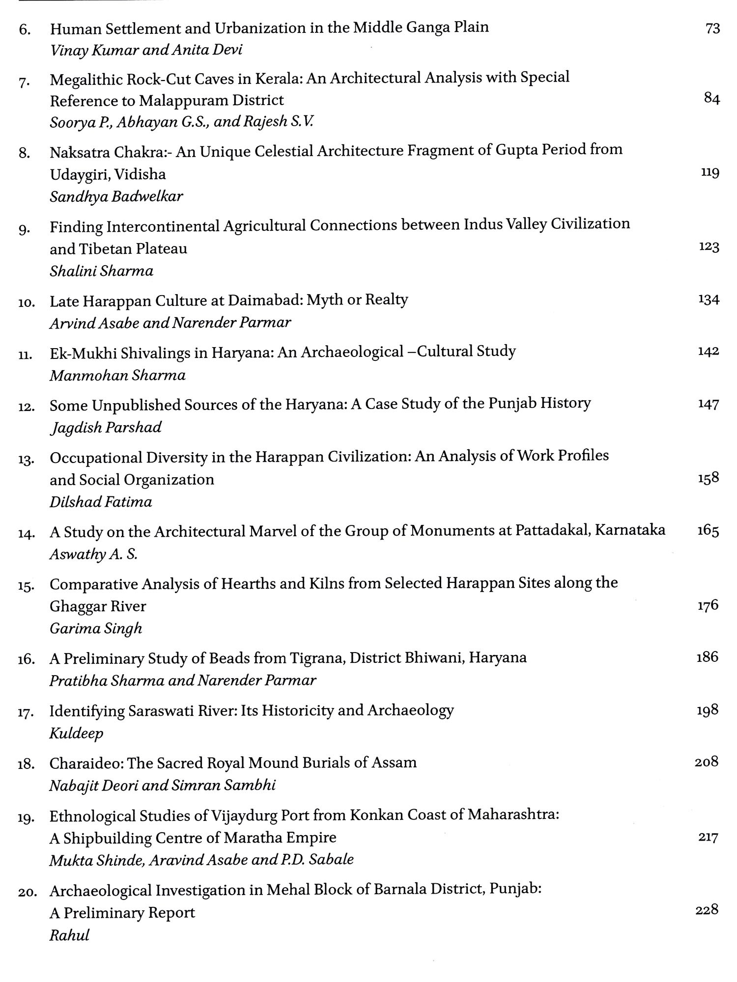 The present volume is a compilation of 26 research papers on various aspects of Indian archaeology. including Acheulian culture, Neolithic culture, rock-cut caves, the Harappan civilization, architecture, historical archaeology, and recent explorations, among others. I hope this volume will be beneficial to all researchers working in the field of Indian archaeology. First and foremost, I acknowledge all the authors of this volume for their scholarly contributions. Without their help, I would not have been able to complete this felicitation volume.