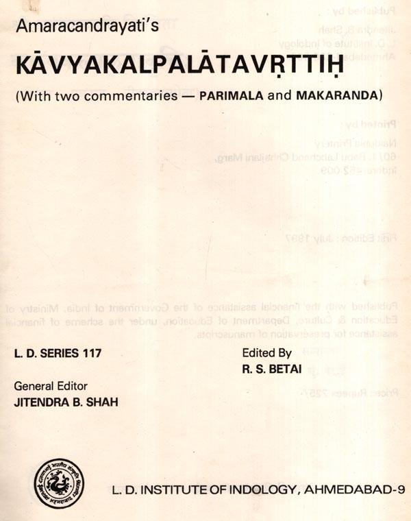 We have therefore undertaken this ambitious programme of preparing a thoroughly revised critical edition of काव्यकल्पलतावृत्ति together with the 'Parimala' as also the 'Makaranda', the latter two seeing the light of publication for the first time. This would be a fit tribute to the tireless scholarship and erudition of Amara Candra Yati, whose life-time work now fully appears in print. We have made use of so many very valuable and old mss. and referred to several others for revision of the printed text and a critical editing of the 'Parimala' and 'Makaranda'.